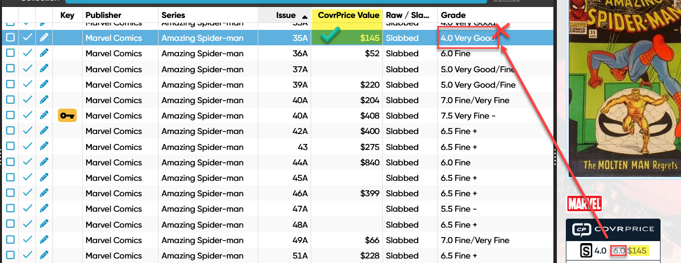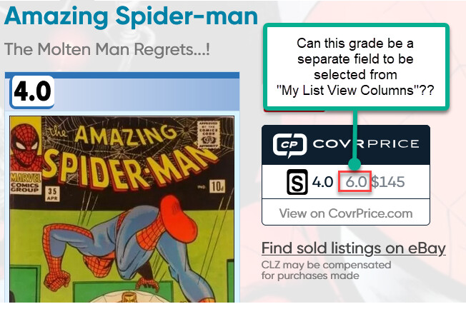Is it possible to have CoverPrice return a “CoverPrice Grade” so that it can be selected to display on views and reports?? Fox example: In the screen shot below it would help if we could display a “CovrPrice Grade” in addition to “CovrPrice Value” , the way its shown now is incorrect - the value $145 is not for a grade 4.0 but for a most common grade 6.0.