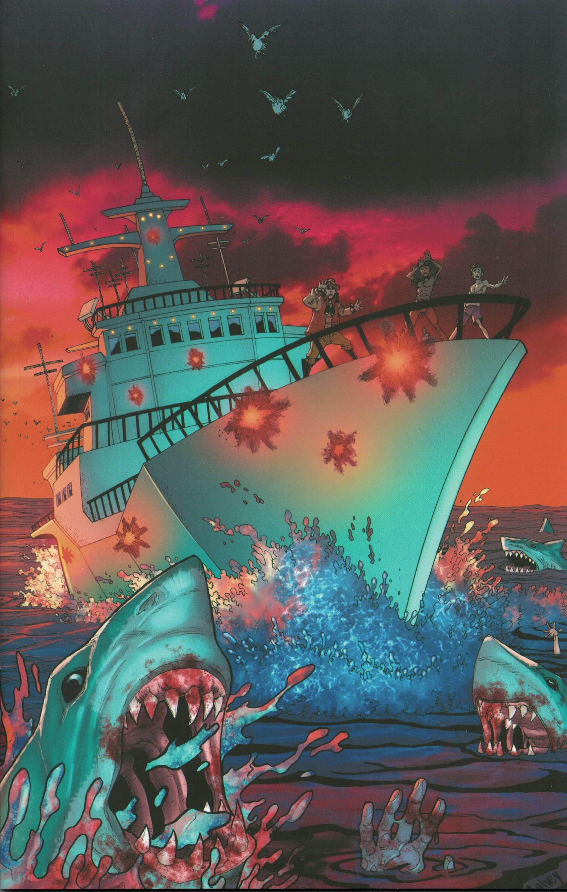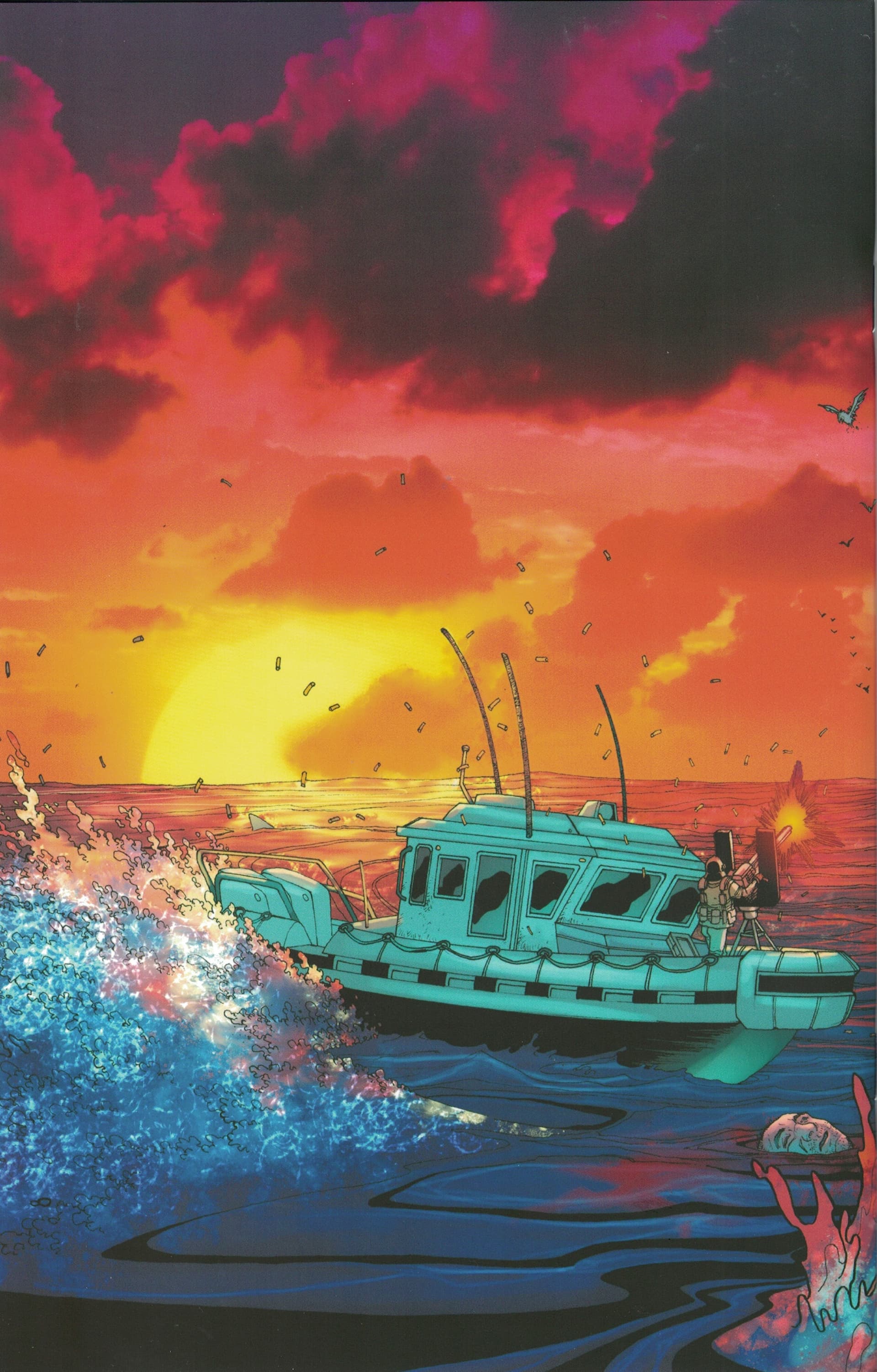 Here’s a scan of the variant covers for this issue, artwork by Joe Mulvey and colors by Chris Sotomayor. It’s wraparound, but my scanner isn’t big enough to do both sides as once.