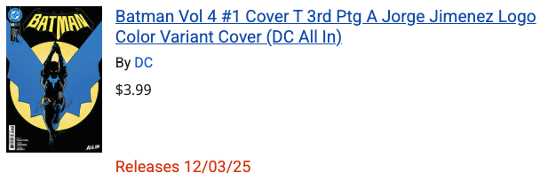 [Added] MISSING: Batman Vol 4 #1 3rd Ptg A Jorge Jimenez Logo Color Variant Cover (DC All In)
