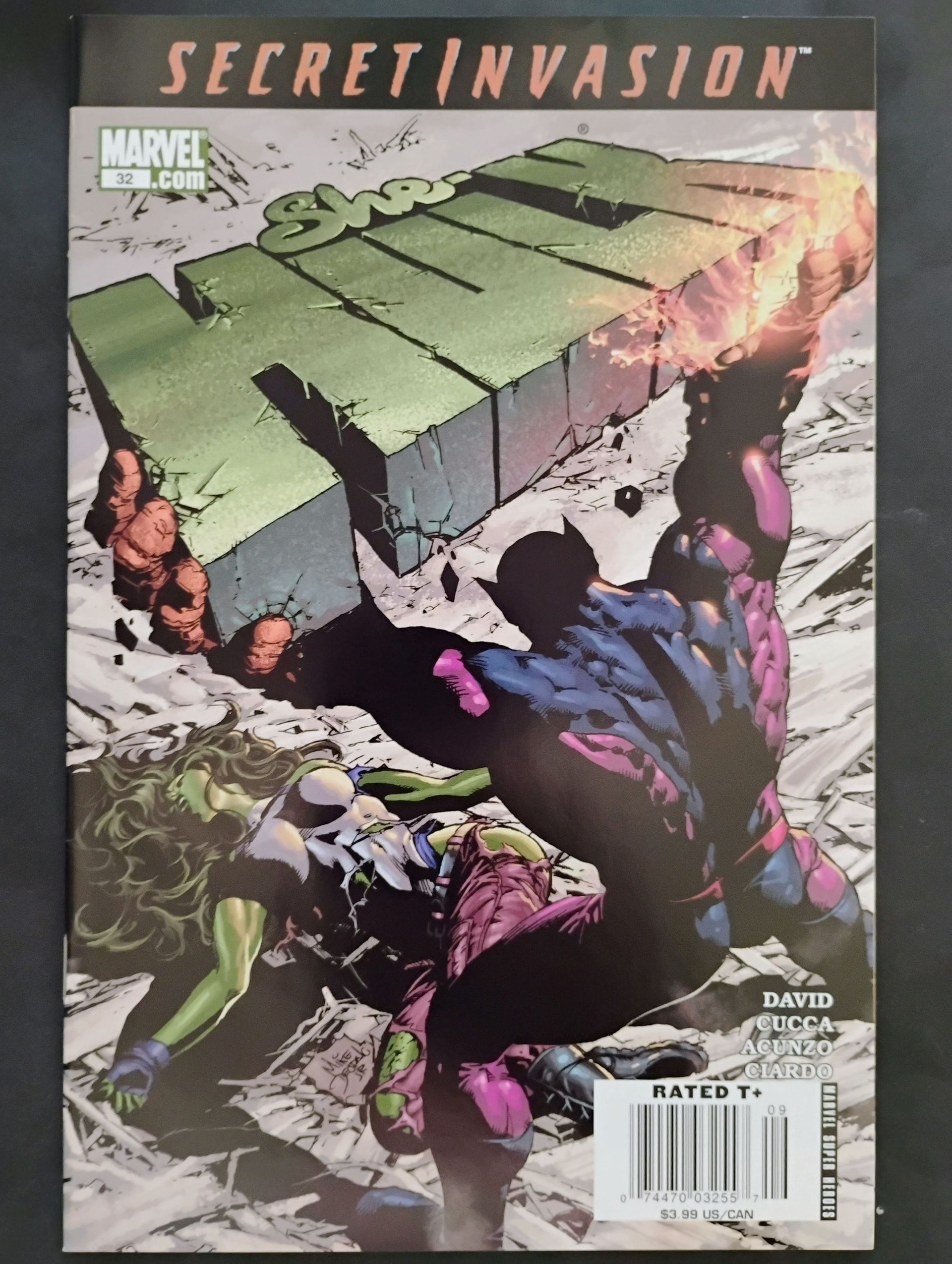 You do not have a slot for She-Hulk #32 vol. 2, newsstand edition. It would be variant #32c because you have a variant in the slot for #32b. I included the back cover….the bar code is 07447003255709