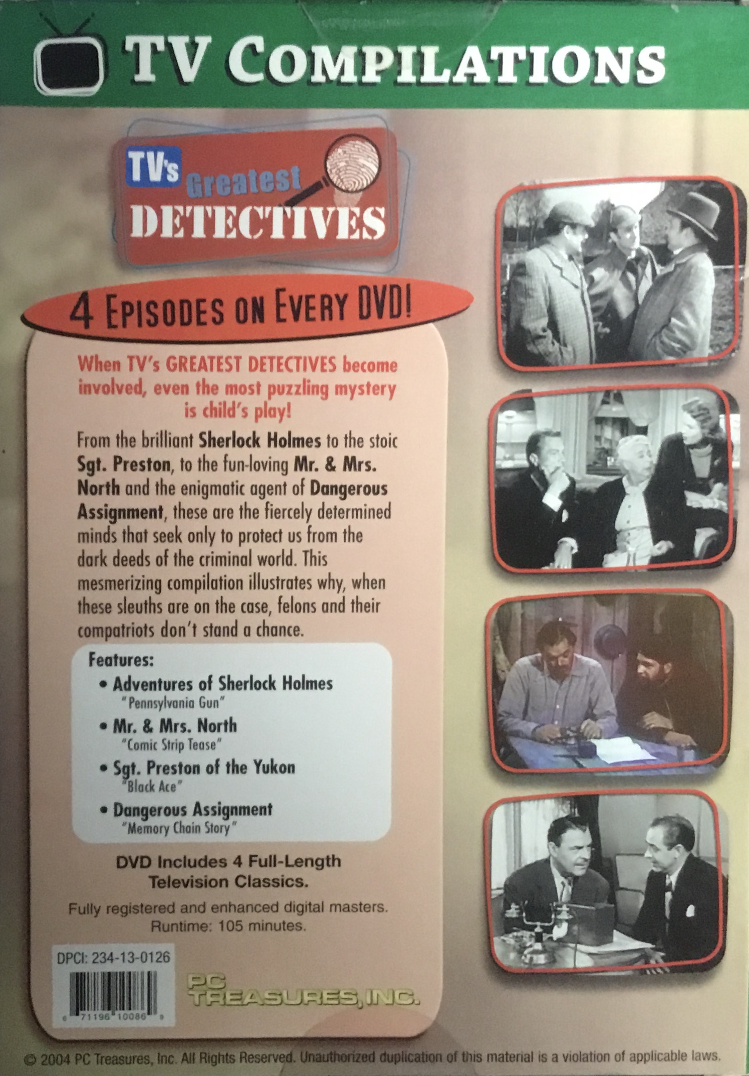 Barcode 671196100869 shows up as unrecognized. It belongs to the dvd album called TV’s Greatest Detectives and the distributor is PC Treasures. There are four tv episodes for different tv titles. Total run time is 105 minutes. The episodes are (with IMDb titles):