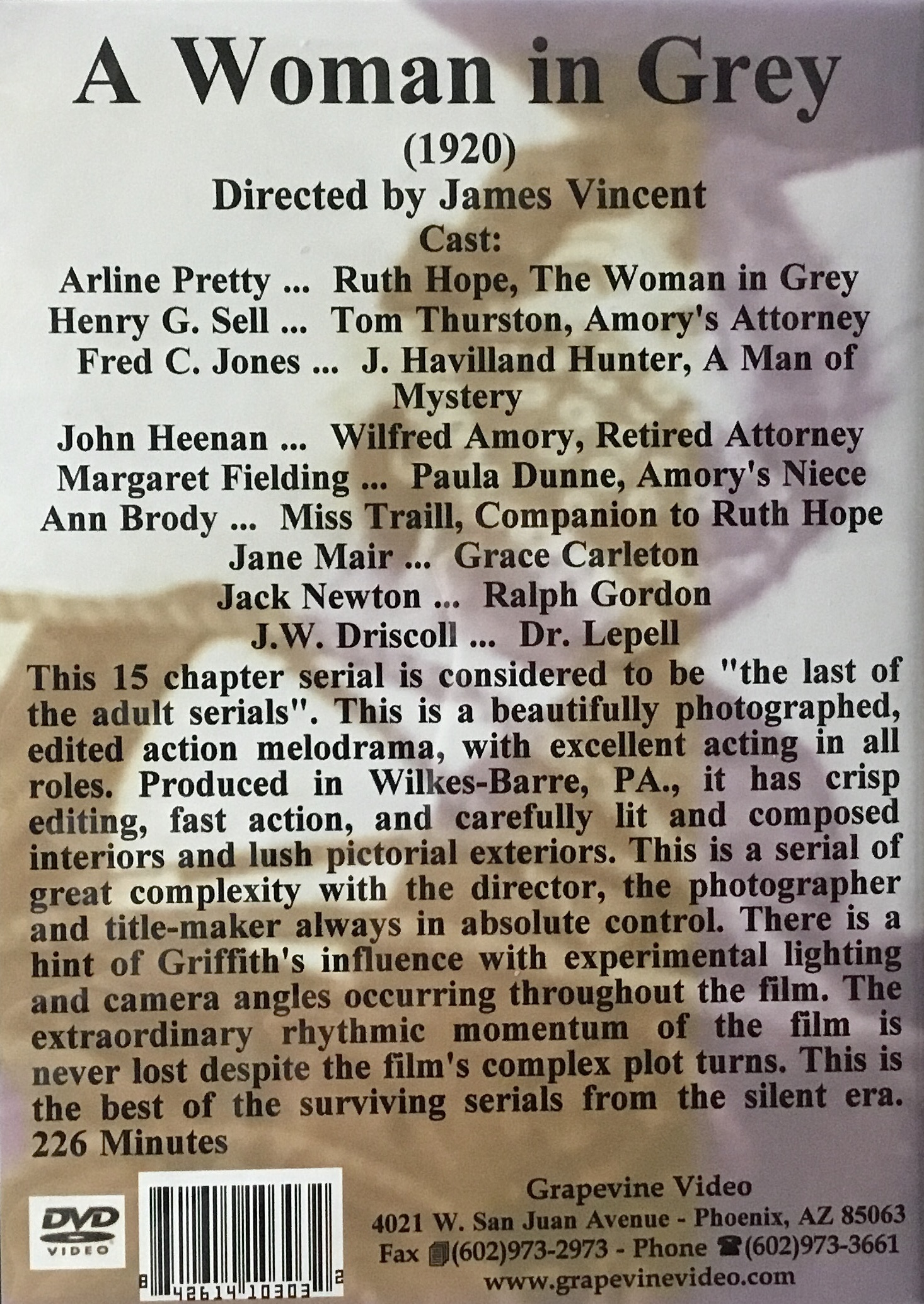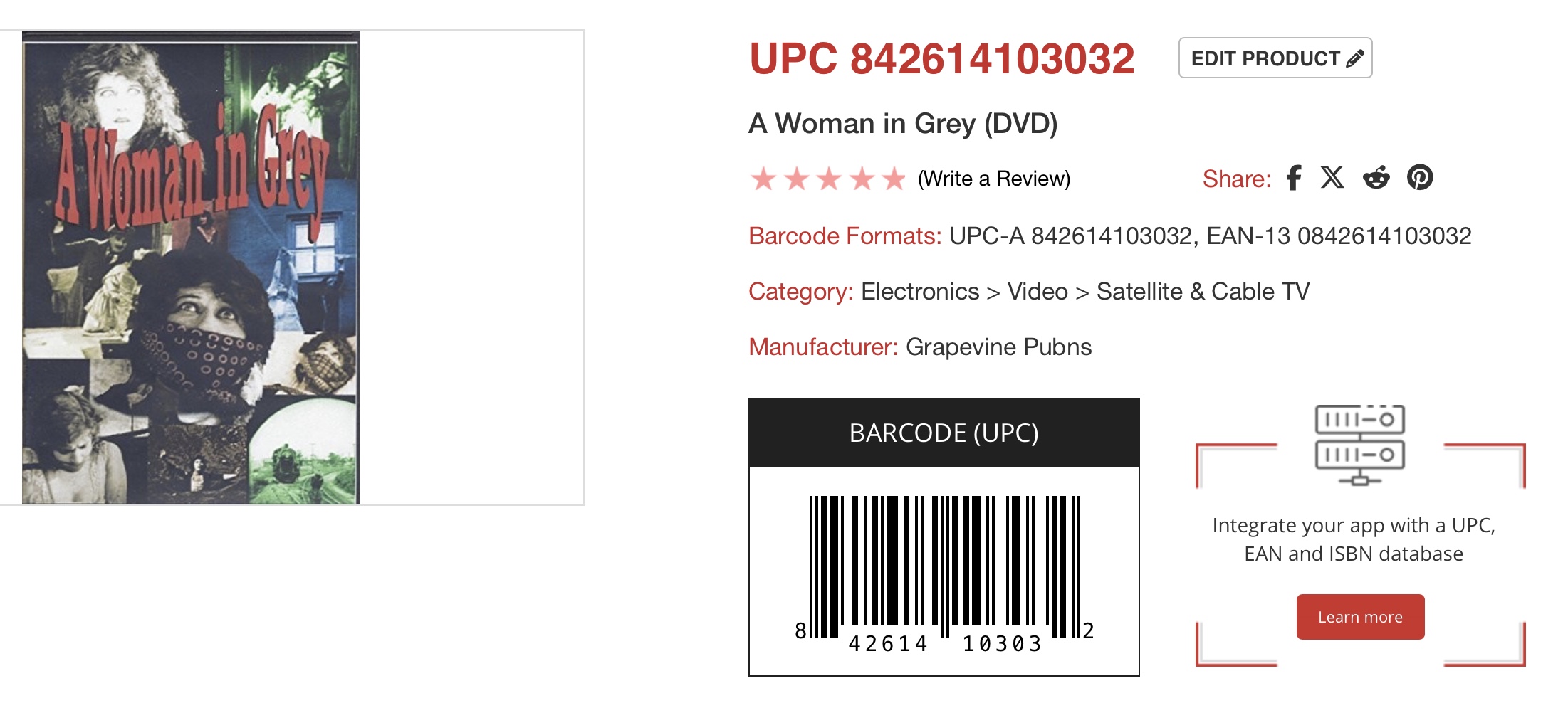 Barcode 842614103032 shows as unrecognizable. It should be for the dvd A Woman in Grey put out by Grapevine Video in a two-disc album.