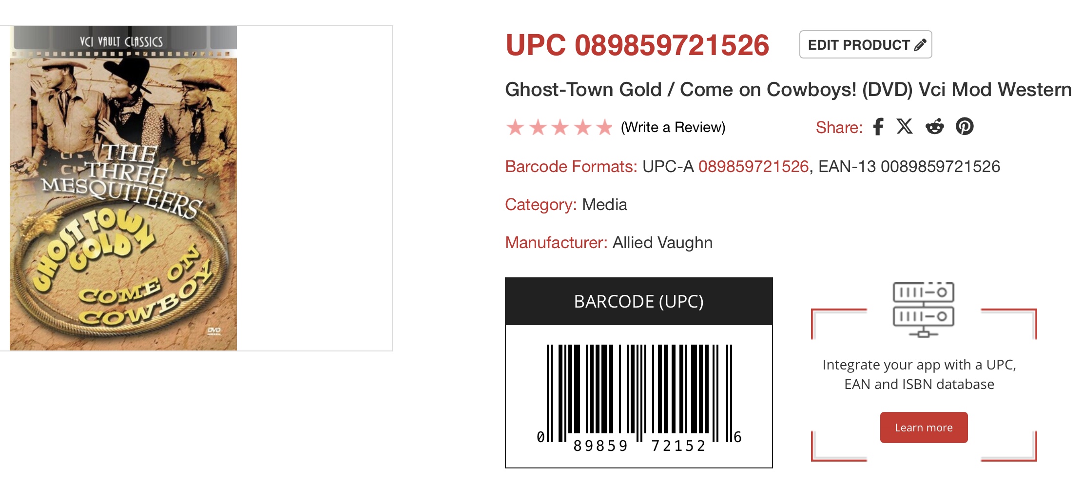 You show barcode 089859721526 as unrecognizable. It is for the double-feature box set The Three Mesquiteers Double Feature. The two movies are: