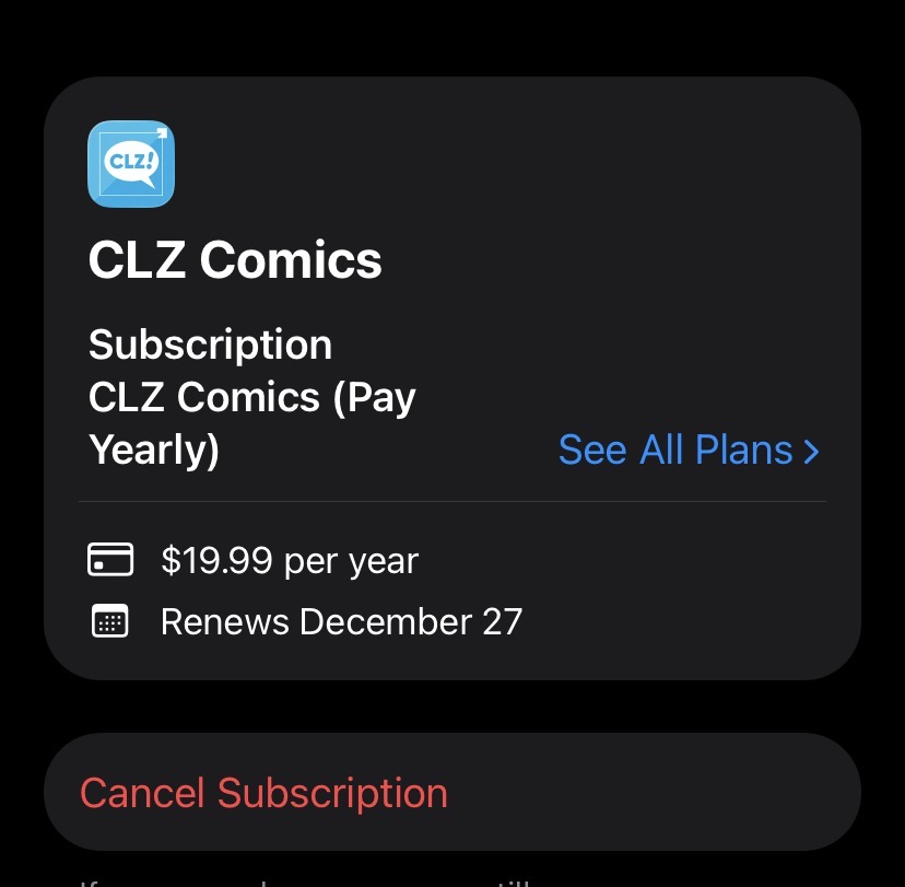My CLZ Comic mobile subscription expires on December 28, 2026. However, in my Apple account, I’m scheduled for another payment on 27 December this year. So, apparently I’m paying a year in advance. If I cancel the payment through Apple will it also cancel my CLZ subscription? Not sure what to do…