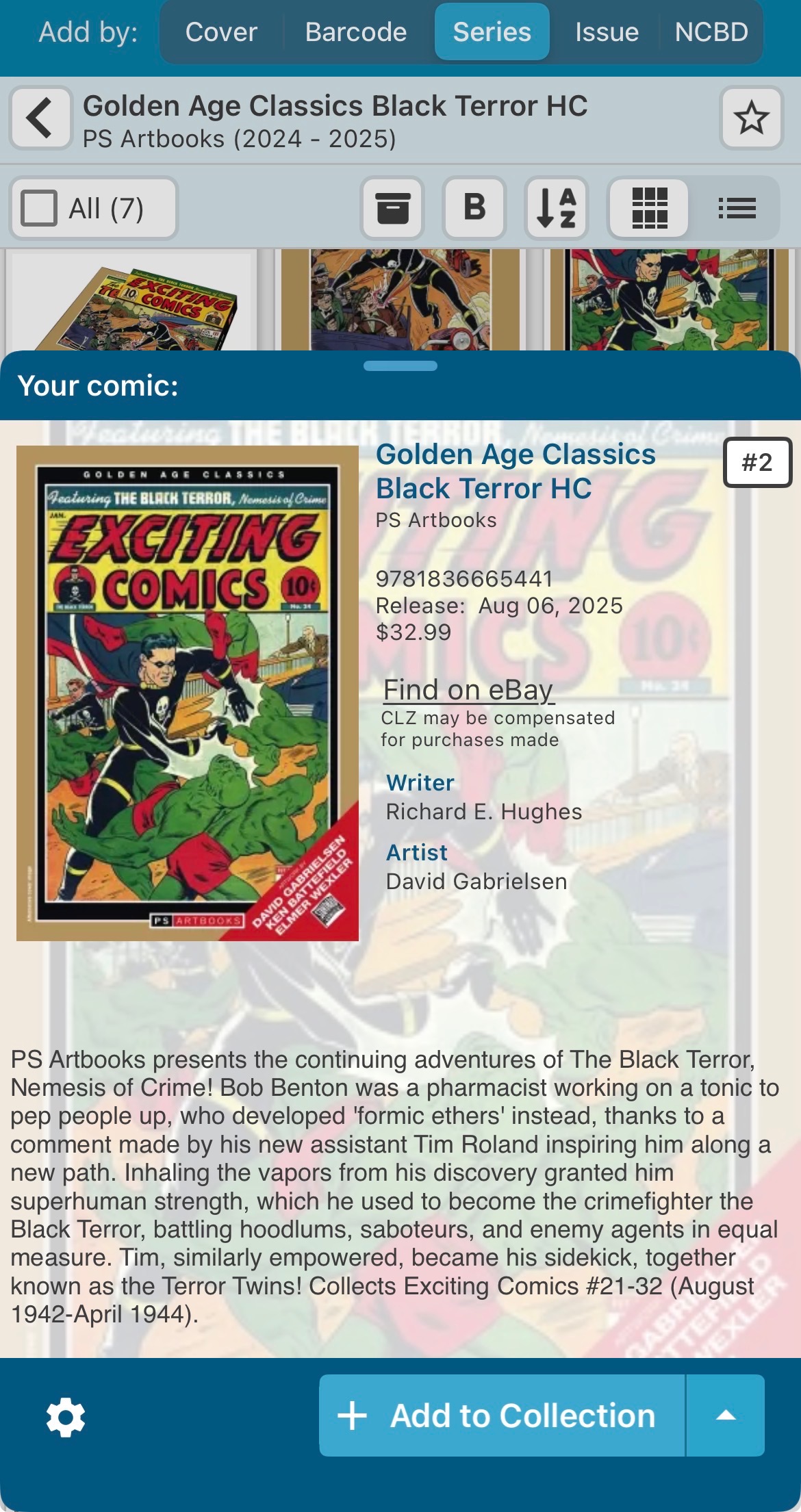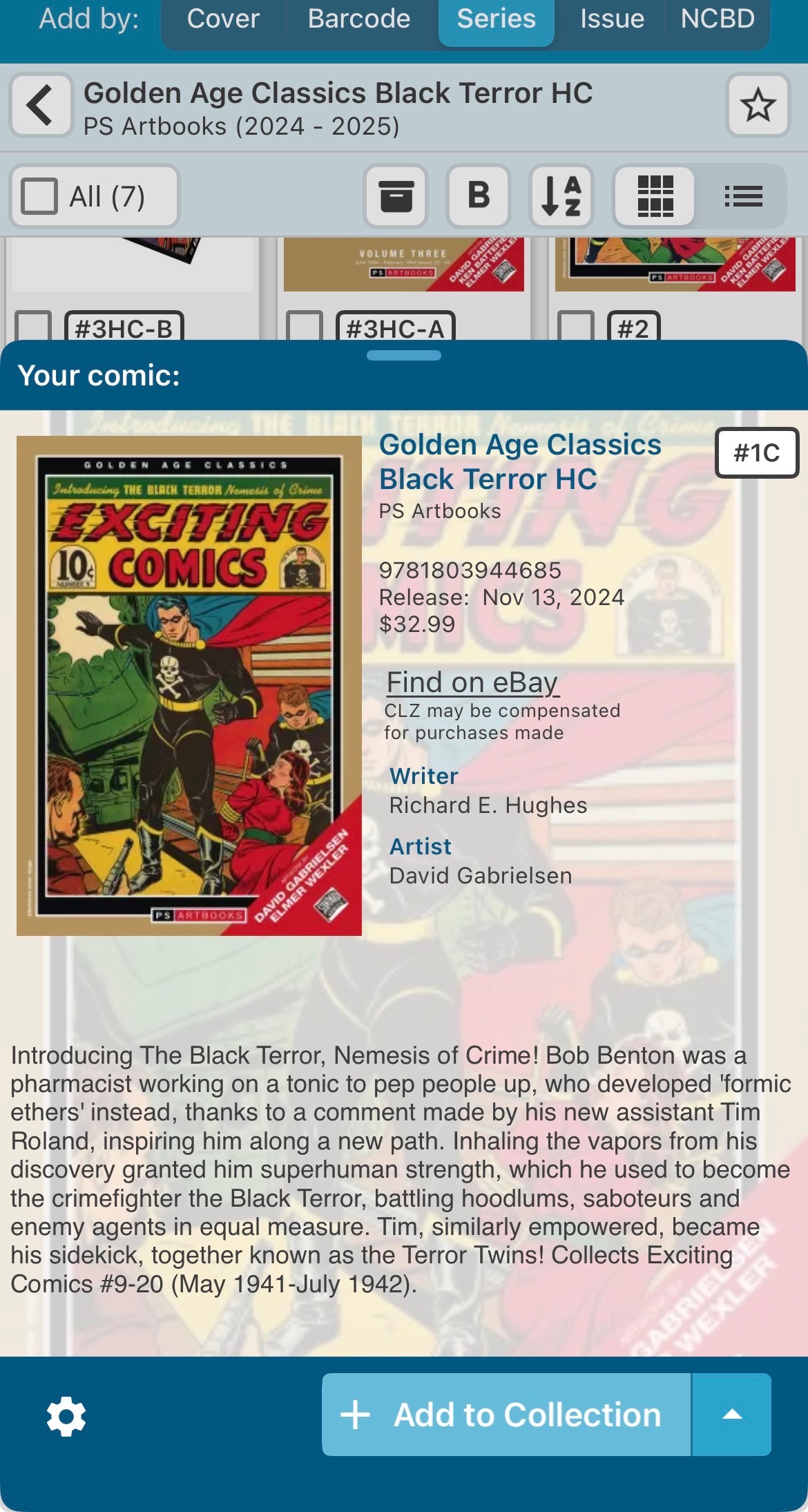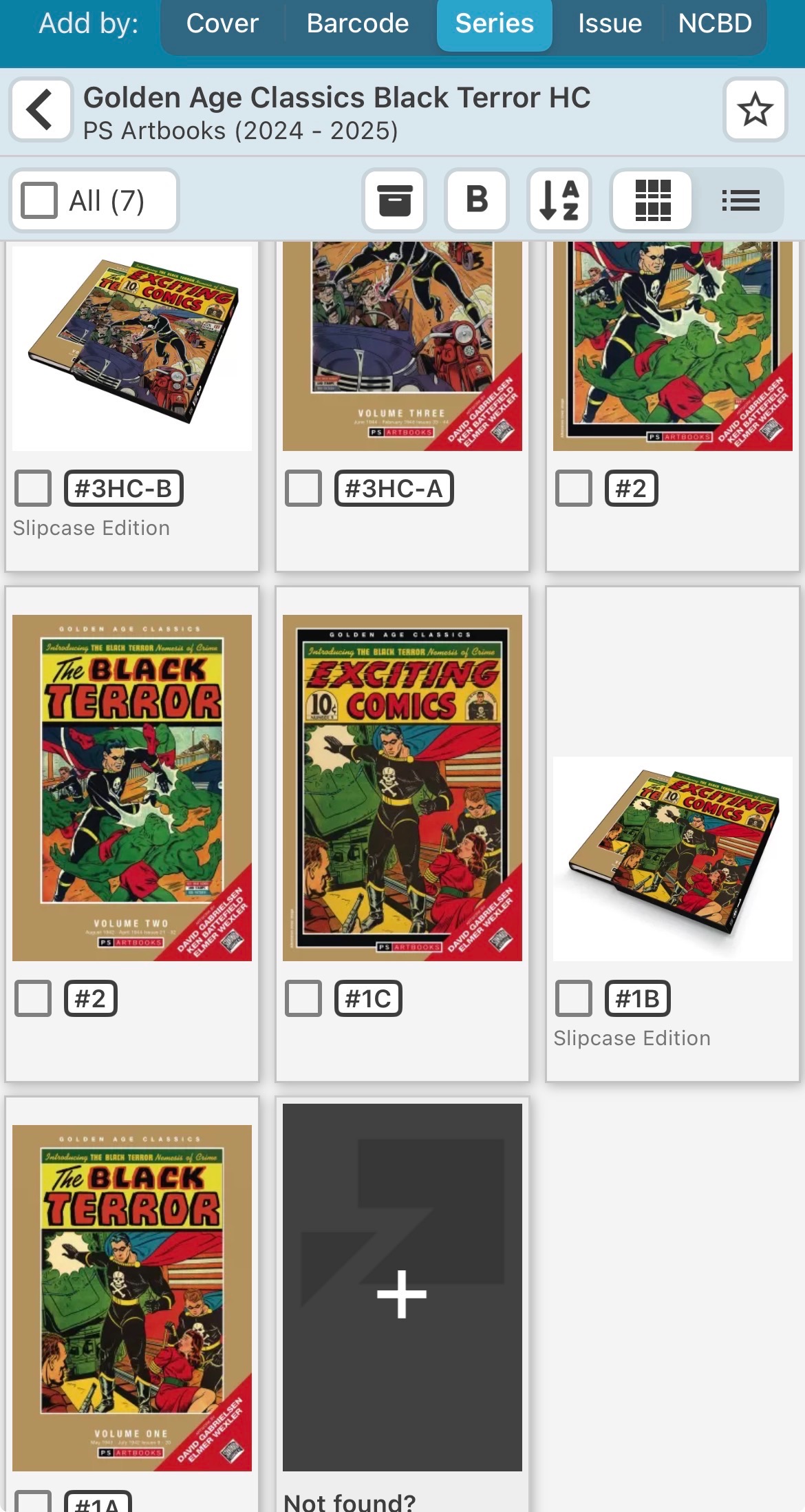 The exiting core title “Golden Age Classic Back Terror HC” includes the 3 issue hardcover issues (this makes sense), 2 of the 3 slipcover issues (in other PS Artbook cases these are their own unique title) and 2 of the 3 softcover issues incorrectly identified as “hardcover” (again, in other cases these are their own unique titles).