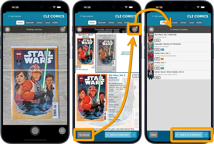 You can use the “Add to queue” button in our app’s Add Comics screen when scanning covers. And then add them all in bulk.