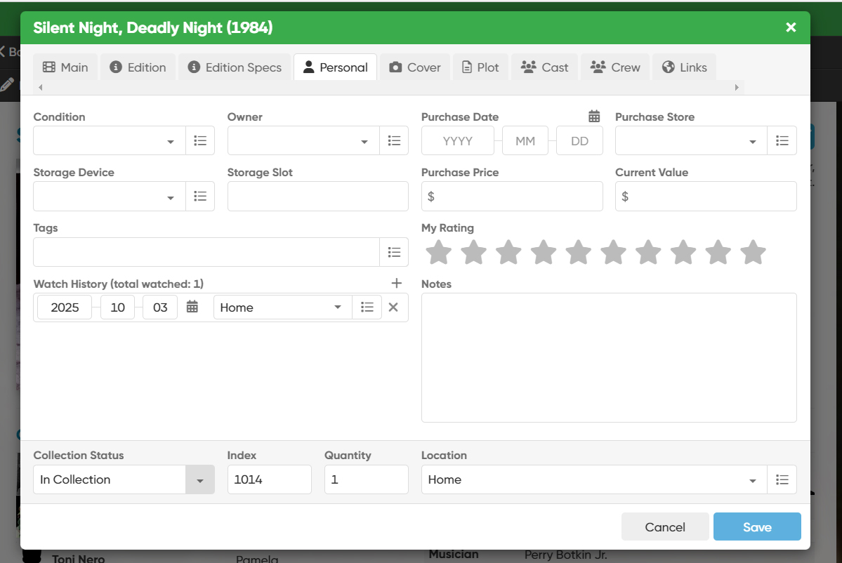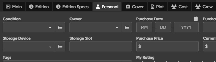 Now there’s a space for purchase date, but I generally don’t fill that one out. It would be nice if in the same area I could put in the date I watch it since I usually watch the movie I put into the database that day.