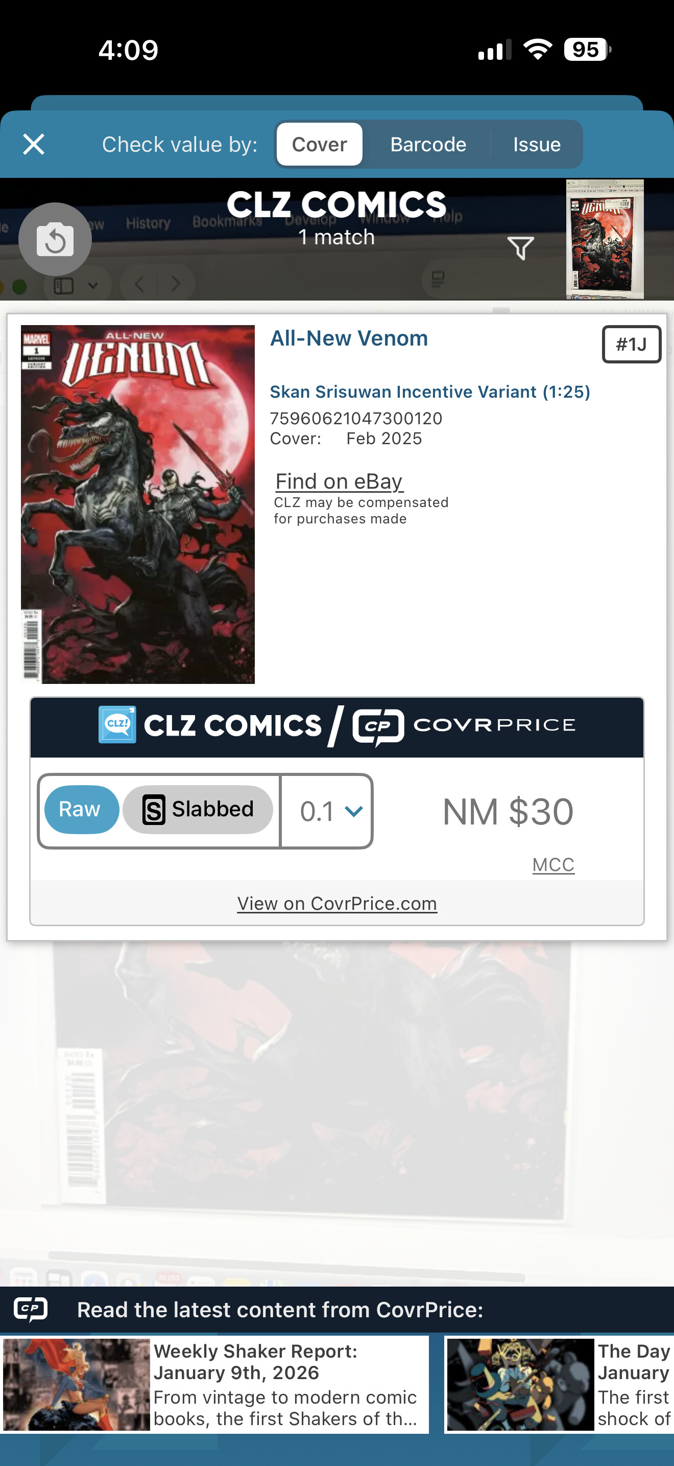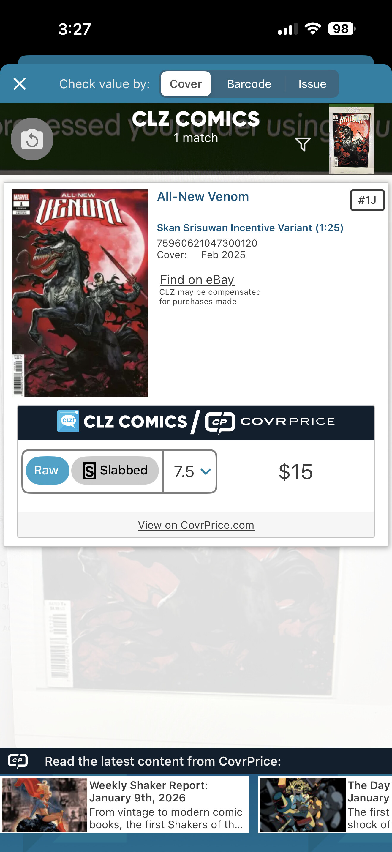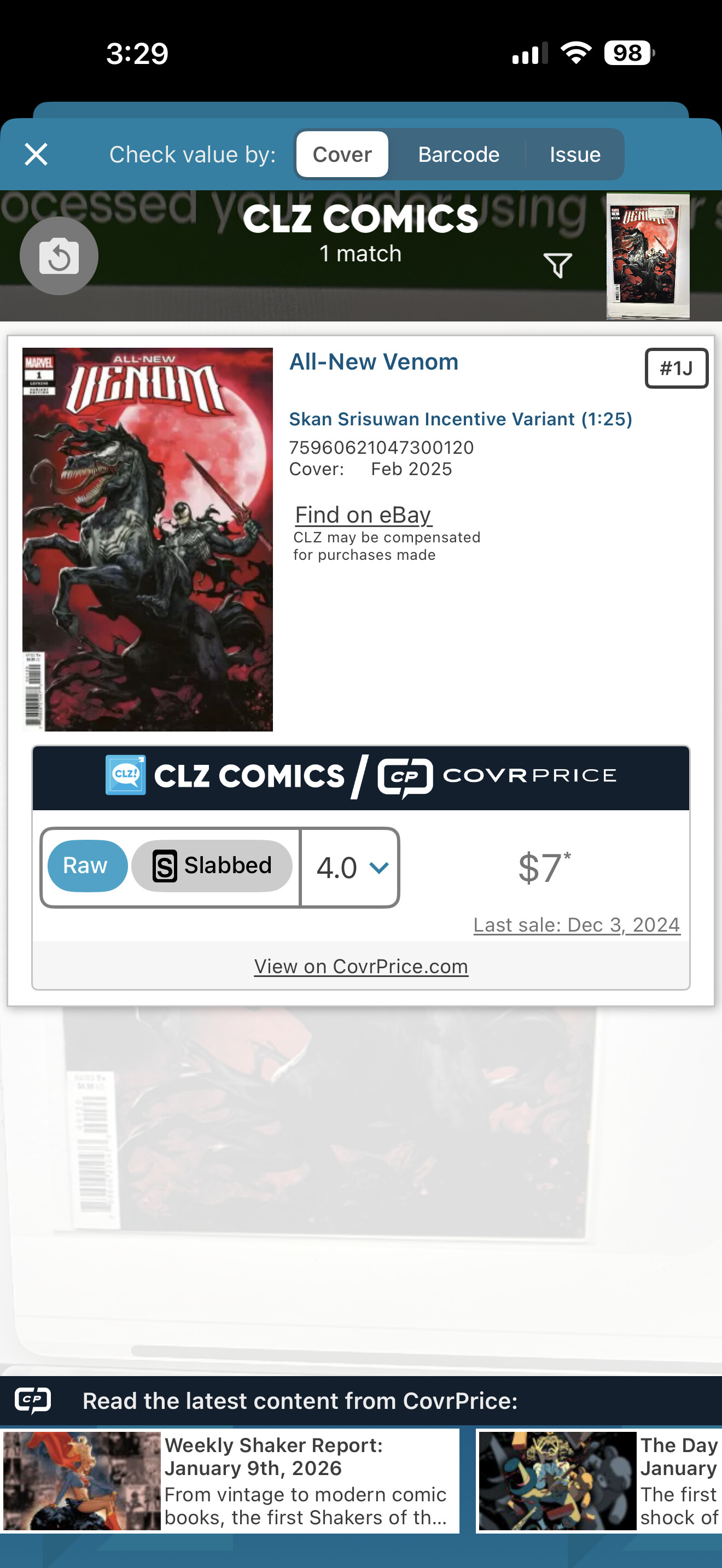 Jan 11, 2026, Sunday, I saw All-New Venom #1J listed on ebay for $3.25 + $5.99 shipping. = $9.24