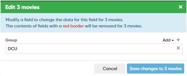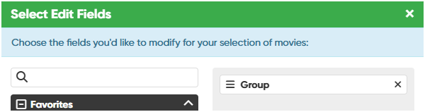 Then I started to add values in the Custom Field Group List. Then I selected multiple Movies and the Edit (all) function with the GROUP field selected for editing , and then “add” to add an first Group value to those movies.