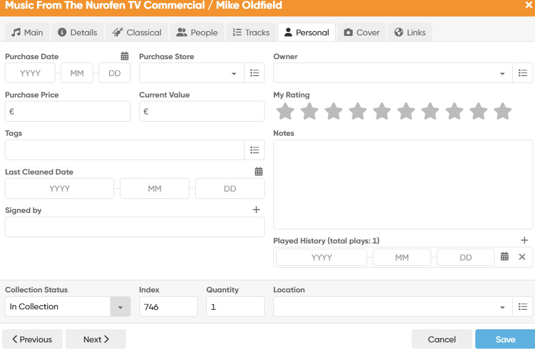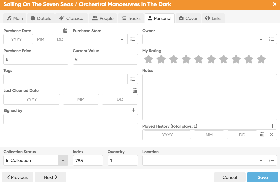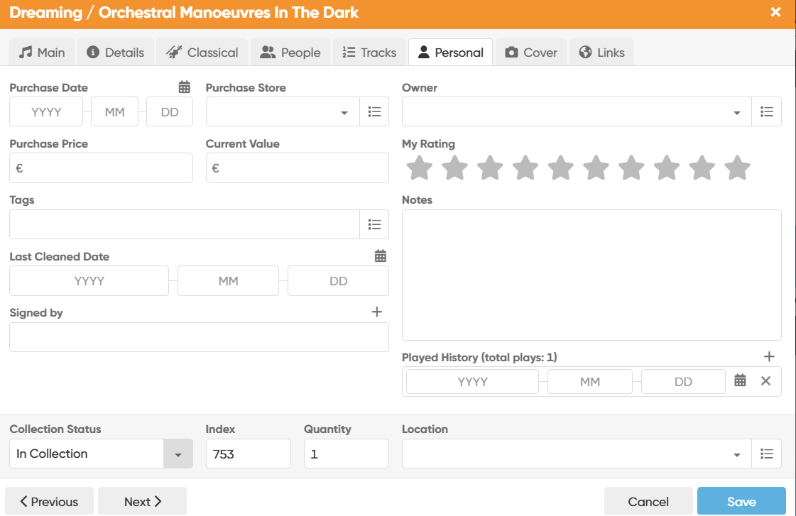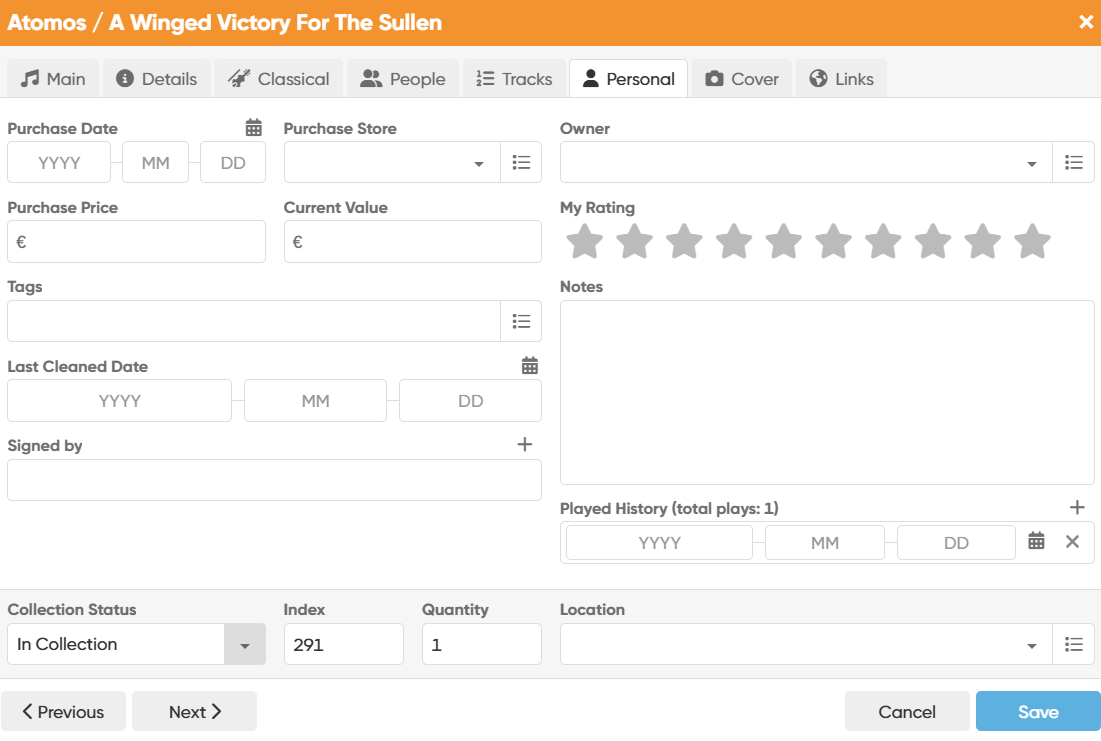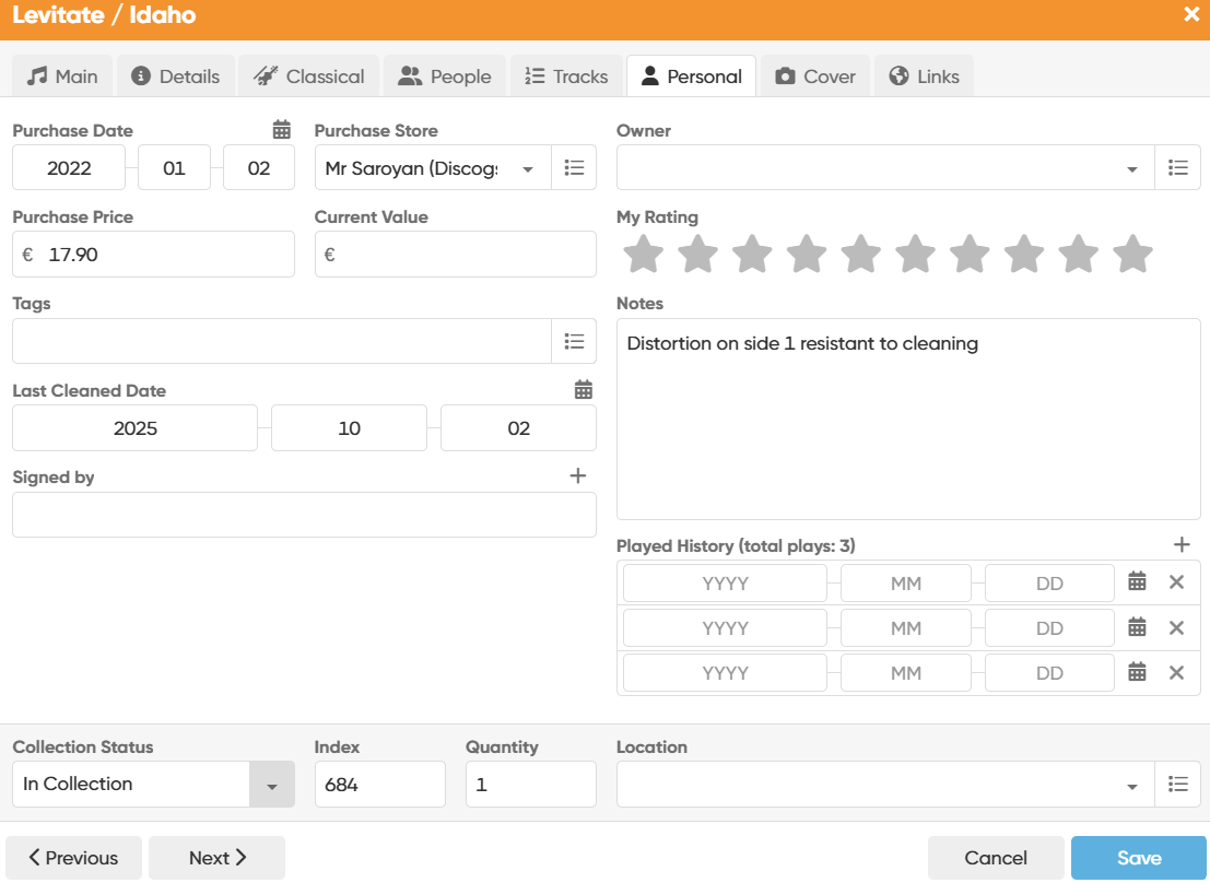 In other cases, the Last Played Date has been lost. For example, index 414 Sigur Ros “Inni” has been played - I played it on 2025/10/04, as indicated by the Last Cleaned Date. It shows “total plays 1” (correct) but blank in Last Played Date (incorrect - should show 2025/10/04).