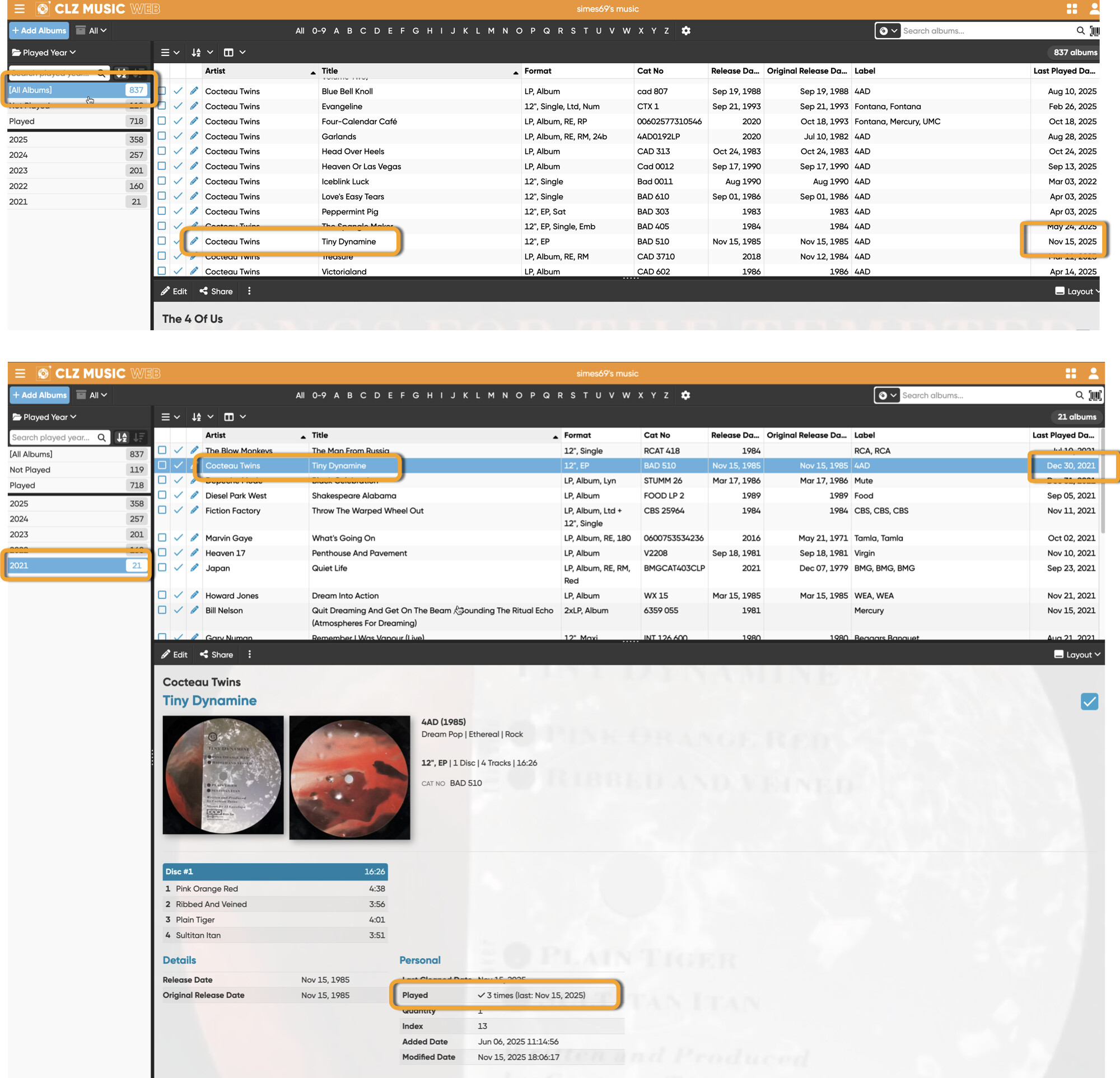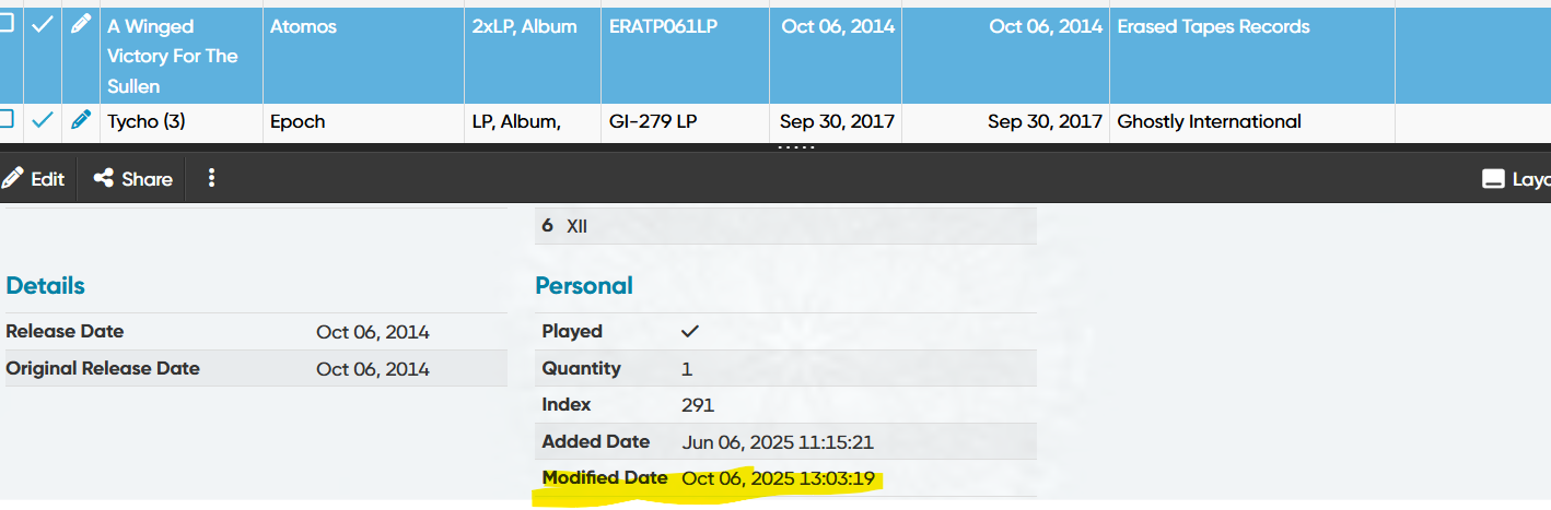 The following examples show albums I am confident that I have played and have recorded the listened dates. This screen-shot shows that three “listened dates” have been lost.This would have occured after 2025/10/02, which is the Last Cleaned Date.