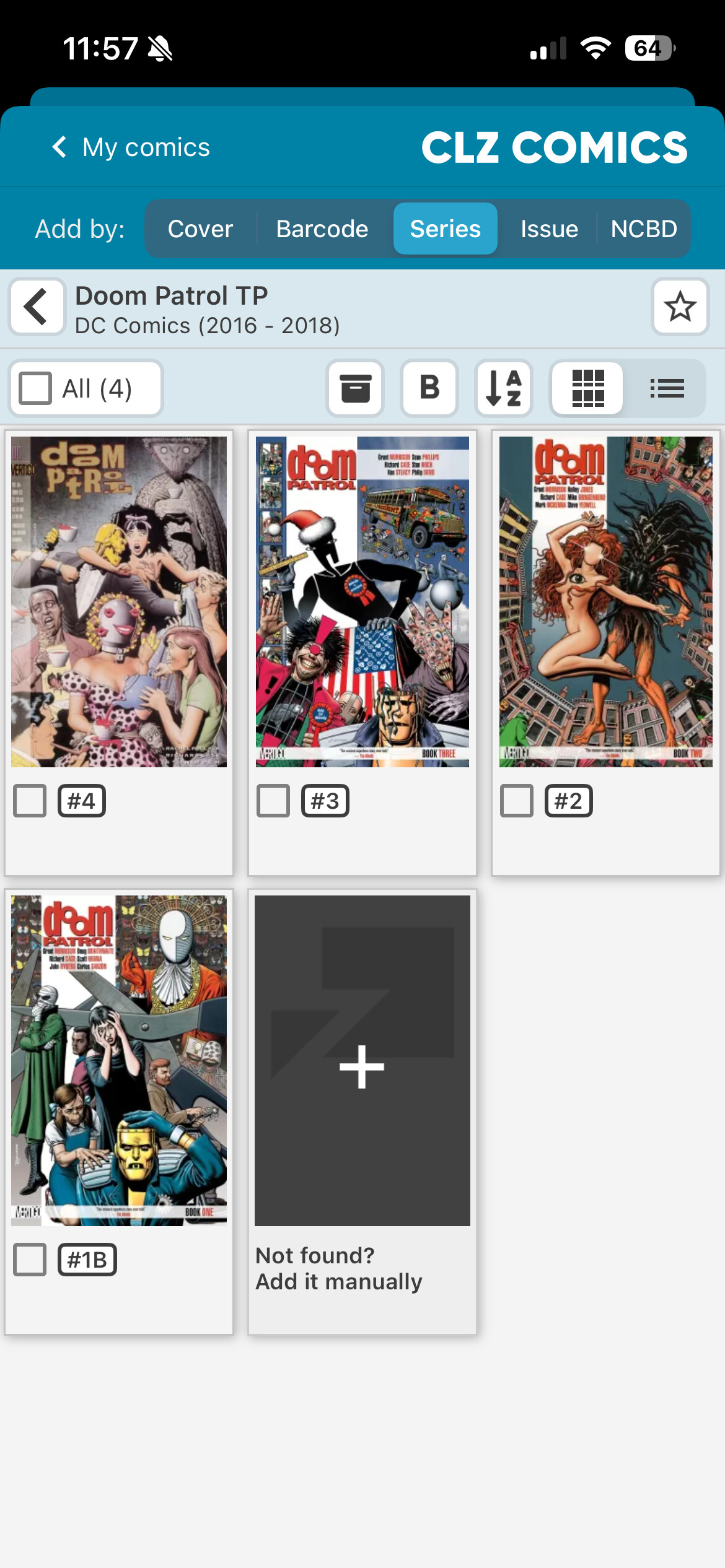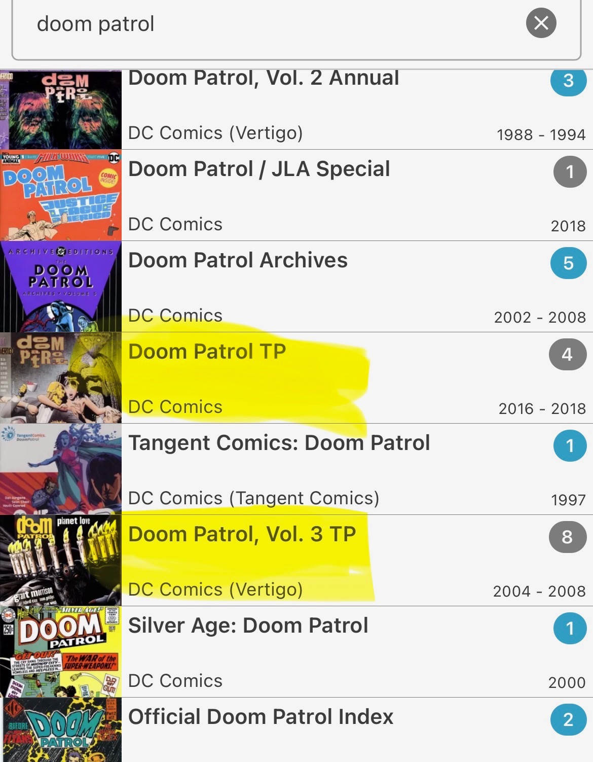 B) The 8 entries (books 1-6) under the title “Doom Patrol, Vol. 3 TP” are also correct in terms of data - except for incorrectly being called V3 - and are collected editions put out between 2000-2008. What makes this a pain in the butt is that cover artwork is sometimes duplicated between the 2 collected edition sets yet they don’t have the same contents ( for example, TPs 1 use the same artwork and the art from #2 in one edition is #3 in the other). Note that this is because set of 4 books covers issues 19-74 and the set of 6 books only covers 19-63.