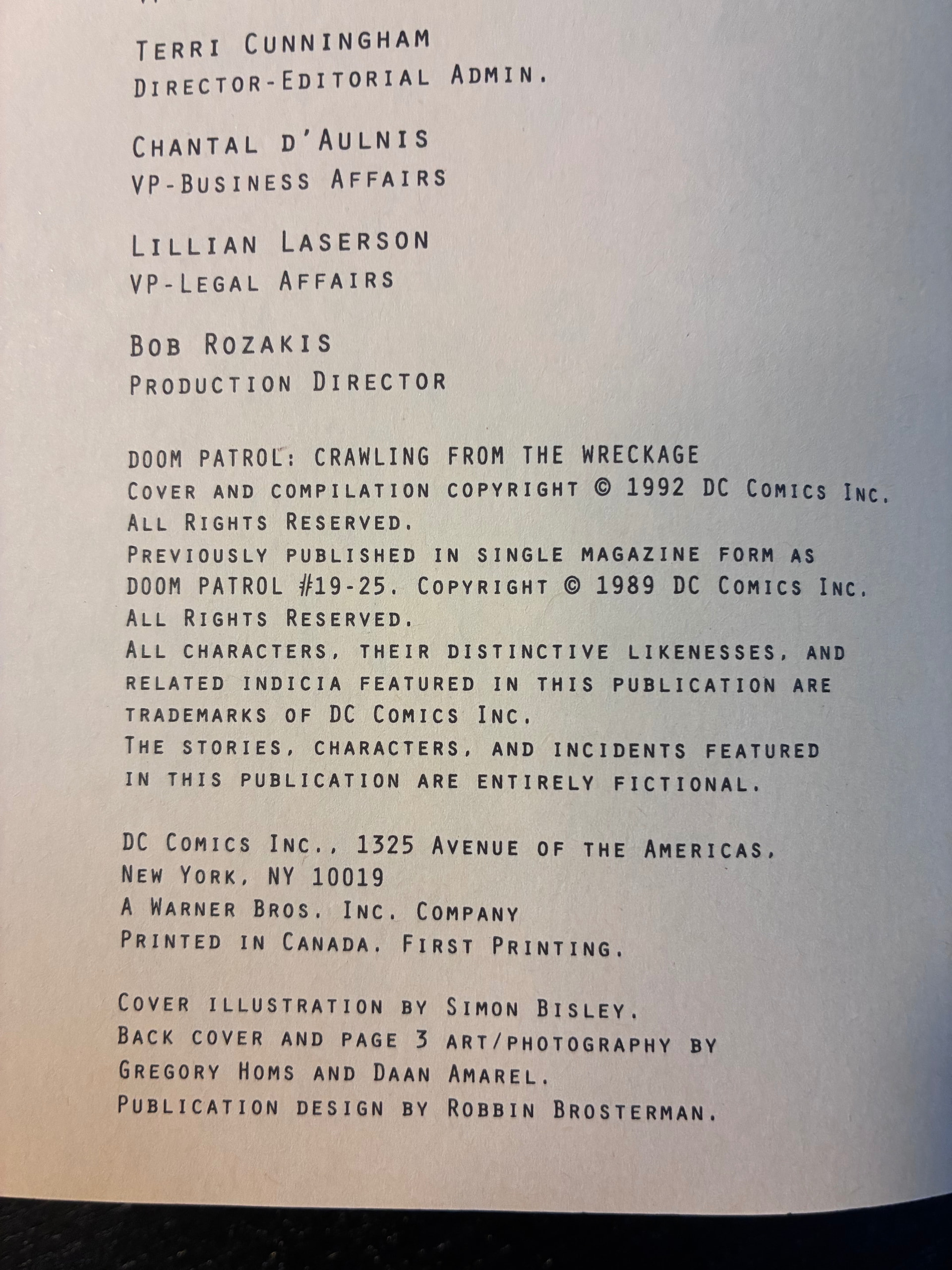 C) In addition, and included as #1TP-B / 2nd Printing 2004 under the “Doom Patrol, Vol. 3 TP” core title is a collection entitled ‘From The Wreckage’ first collected in 1992. The indica for the 1st printing is below. I do not believe any other printings were done nor were any other collections of Doom Patrol Vol.2 made until the 2000-2008 6 book series.