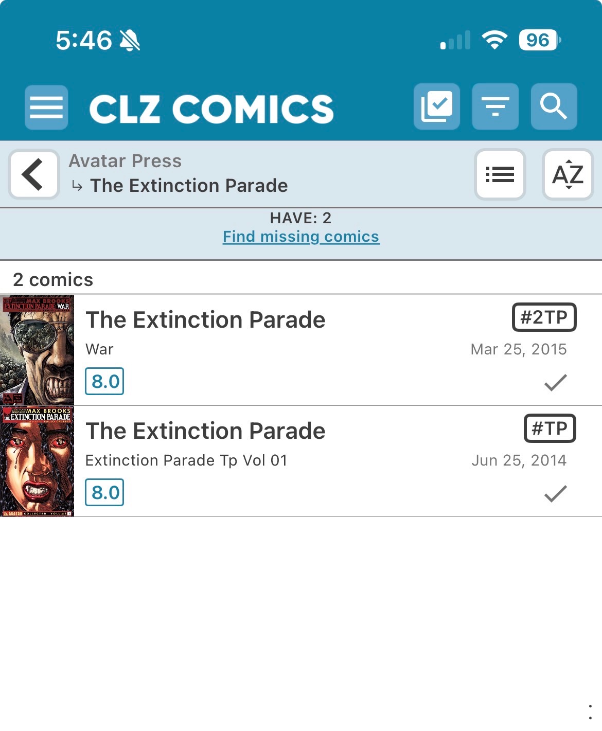 There are 2 5 issue series called ‘The Extinction Parade’ and ‘The Extinction Parade: War’ put out by Avatar that are both in core correctly. What is not correct is the TP for the second series (War) is shown as #2TP under the first series.
