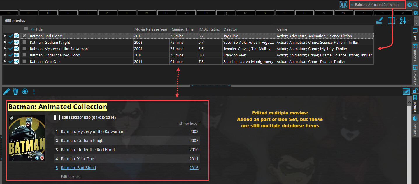 vsHowever, in the past I have added the Batman Animated Collection as multiple database entries. And using the “Edit Multiple Movies” option to add them to a Box Set only results them being listed as part of a box set, but still show as separate entries.