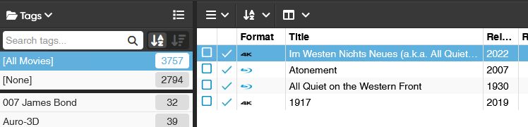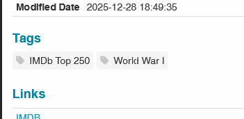 Another case I have: I would like to link one or more movies to each other. For example I want to link all ‘Alex Cross‘ movies, or link movies to each other that occur in the same period like ‘the events or period around Martin Luther King‘ or ‘World War I‘. I think Tags are the best solution for this. But there is no way to quickly filter on the tags. So I did a similar thing: