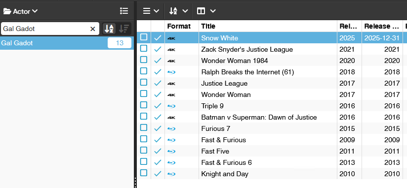 There is a recurring question at my end. When I selected a movie I want to quickly know what other movies I have with the same Actor or from the same Director. An actor/actrice suddenly stands out in a movie, so I want to see if I have more movies with the same actor. The Mobile already has a function for this to click on the actors name (but the whole feature doesn’t work properly on my device, I will report an issue about this separately). The Web is lacking this feature (If I am not mistaken).