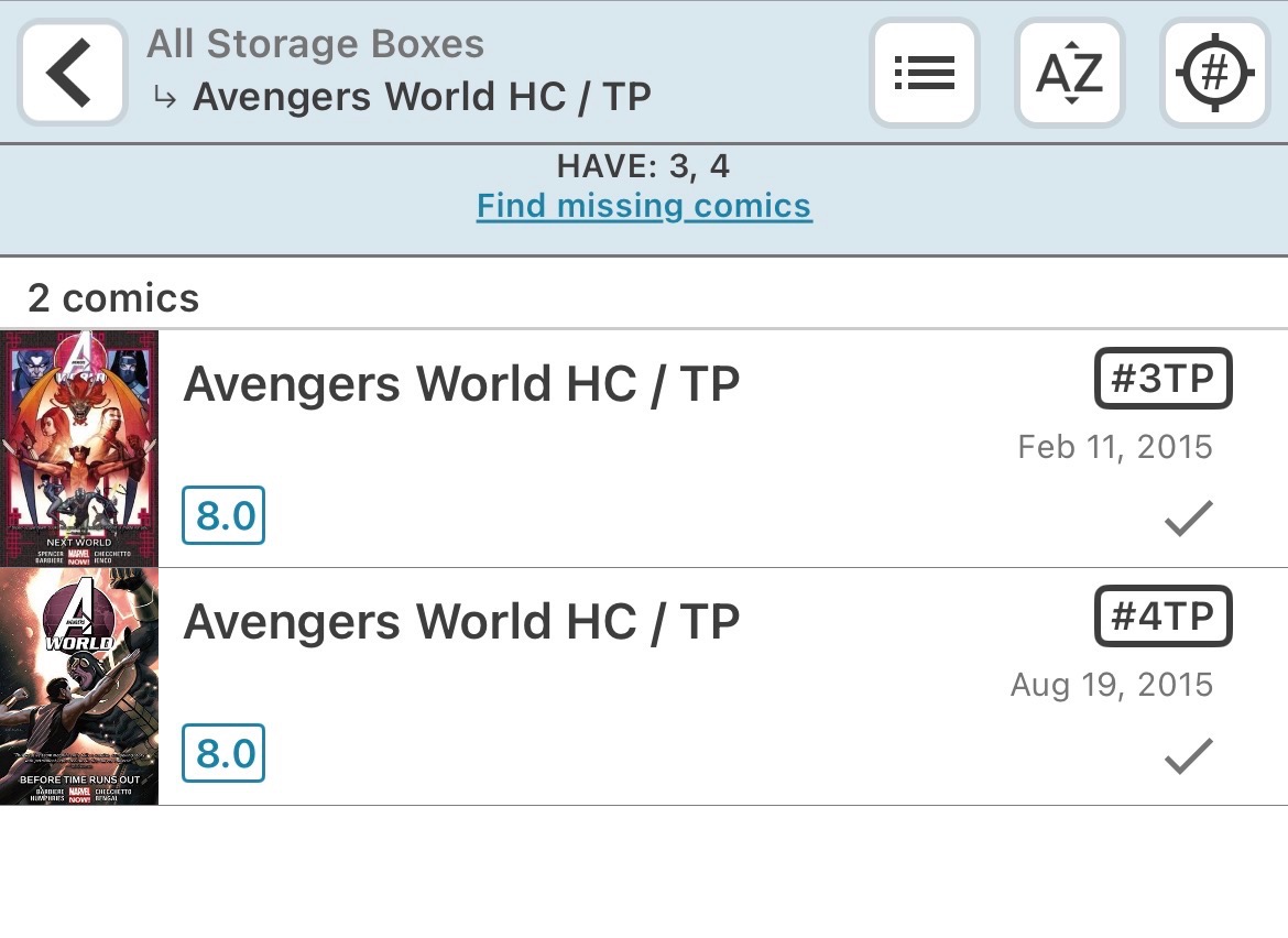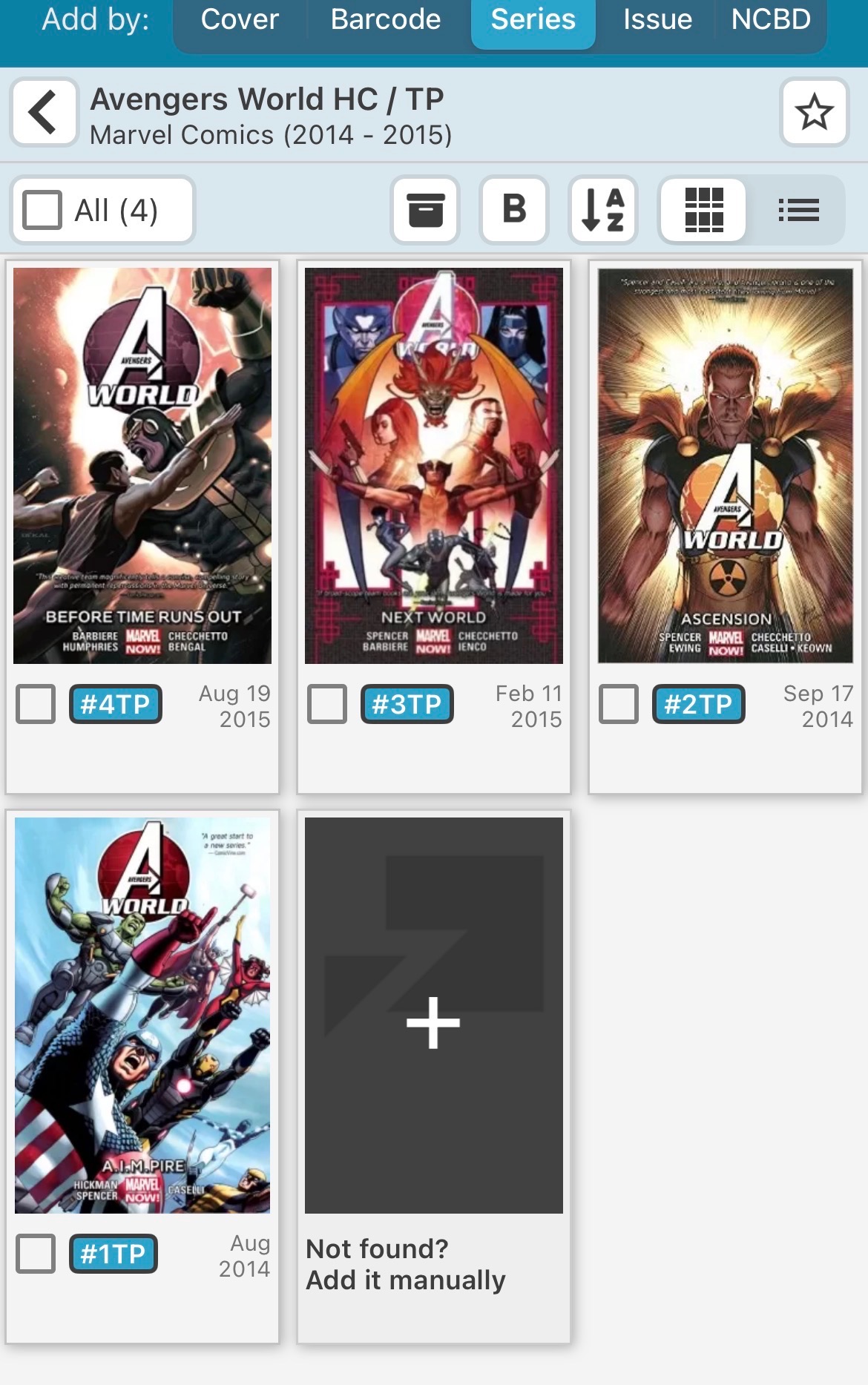 So I then deleted #1 and #2 from my collection and added them in again via the “Avengers World HC / TP” series which now shows all 4 (see pic below) yet the app divided them out again under “Avengers World” (see below as well) … yet those books don’t exist if you press the ‘+’ key and look.