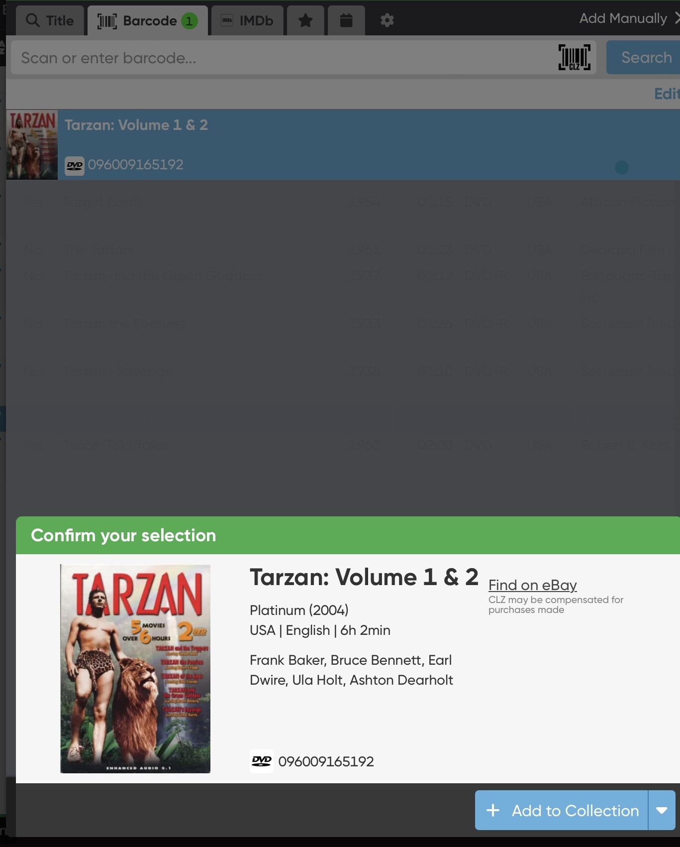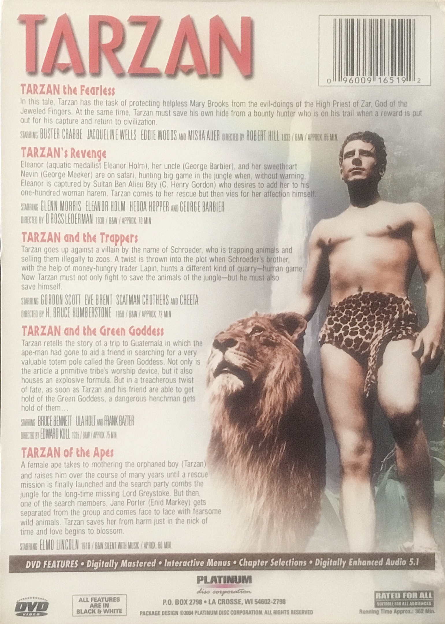 Your search results for barcode 096009165192 shows a single Tarzan album where in actuality it is a box set with 5 movies in 2 discs labeled Tarzan 2 Feature Films and Tarzan 3 Feature films in a box, which is spine-labeled Tarzan 5 Movies 2 DVD. The five movies are shown on the back of the album, the first two in Volume 1 and the next three in Volume 2. Your front cover image is correct. My back cover scan: