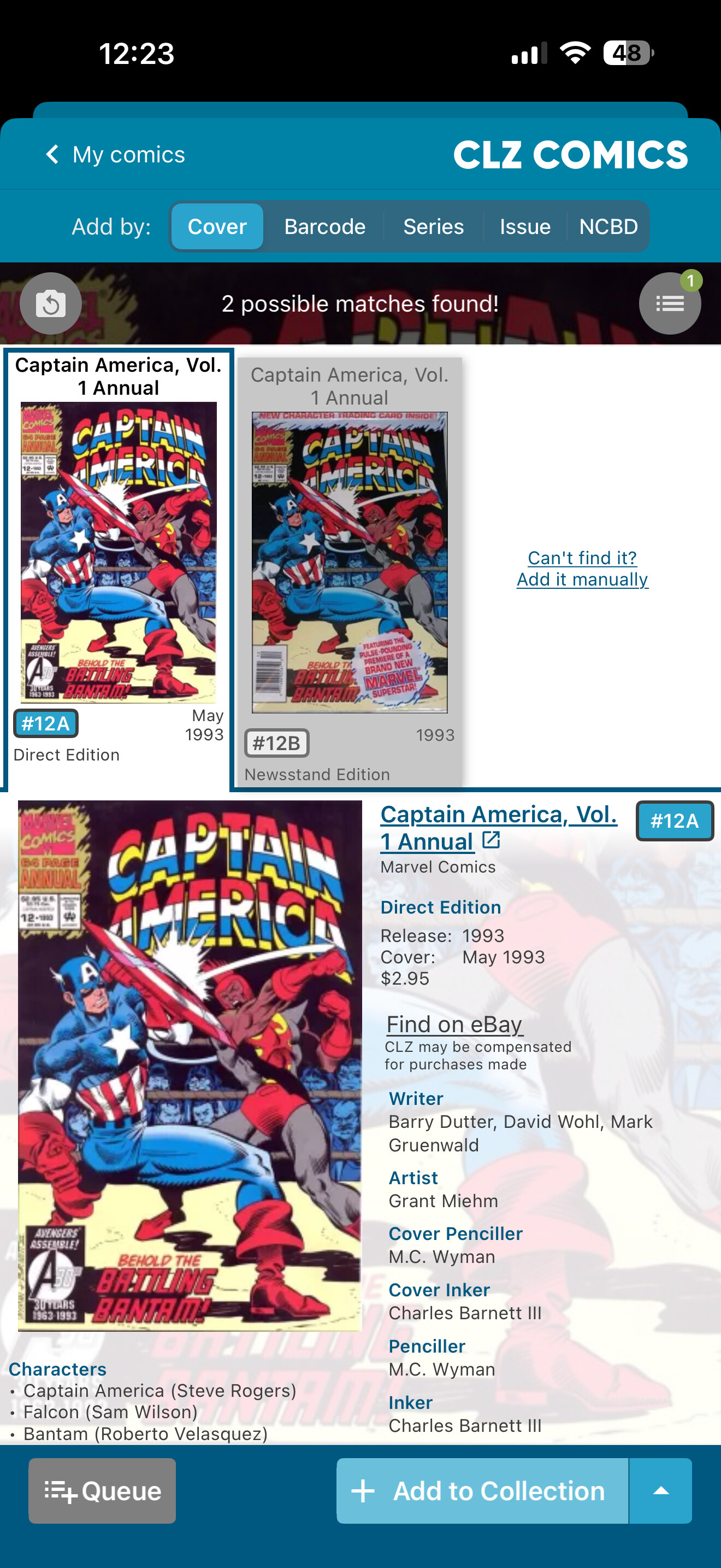 You have Captain America Vol 1 Annual #12B Newsstand Edition listed, which came bagged at the factory with a character trading card included inside, but you don’t have the same for #12A Direct Edition.