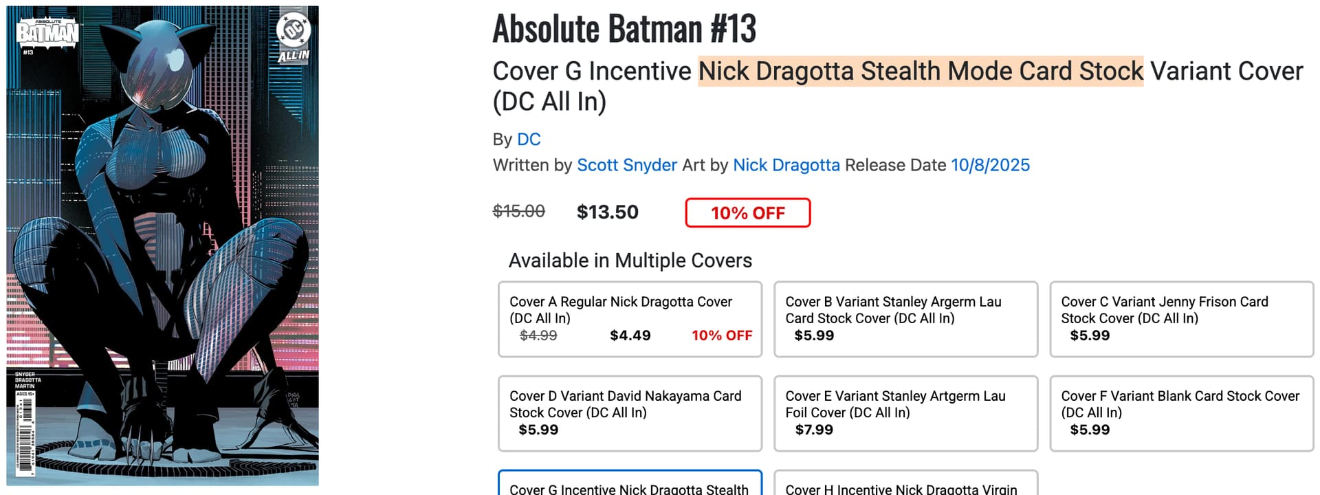 Hello, it currently reads, “David Nakayama Incentive Variant (1:25)” but should read, “Nick Dragotta Incentive Stealth Mode Card Stock Variant (1:25)
