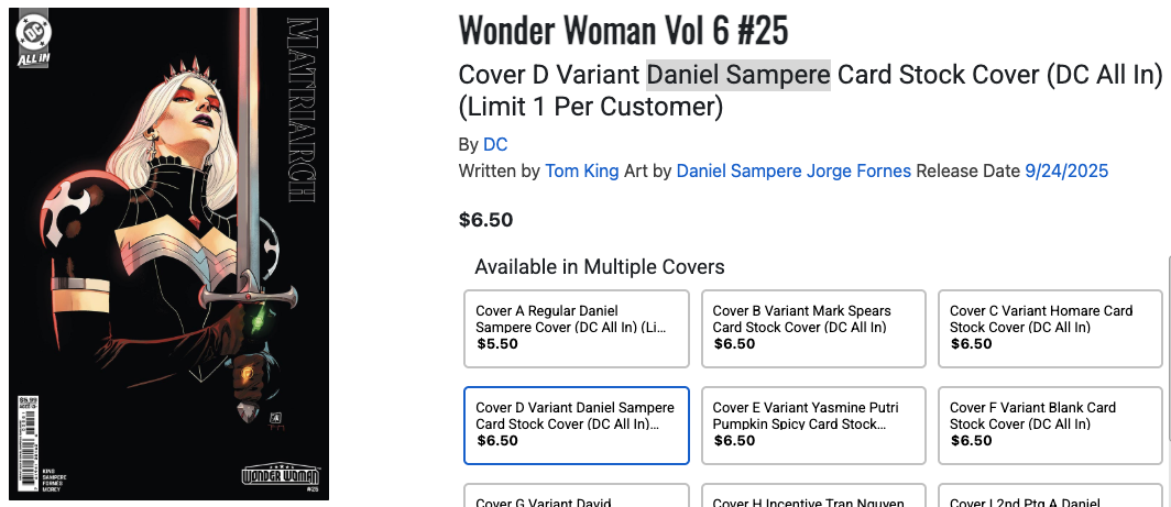 Should read: CORRECT: Wonder Woman, Vol. 6 #25E Daniel Sampere Variant