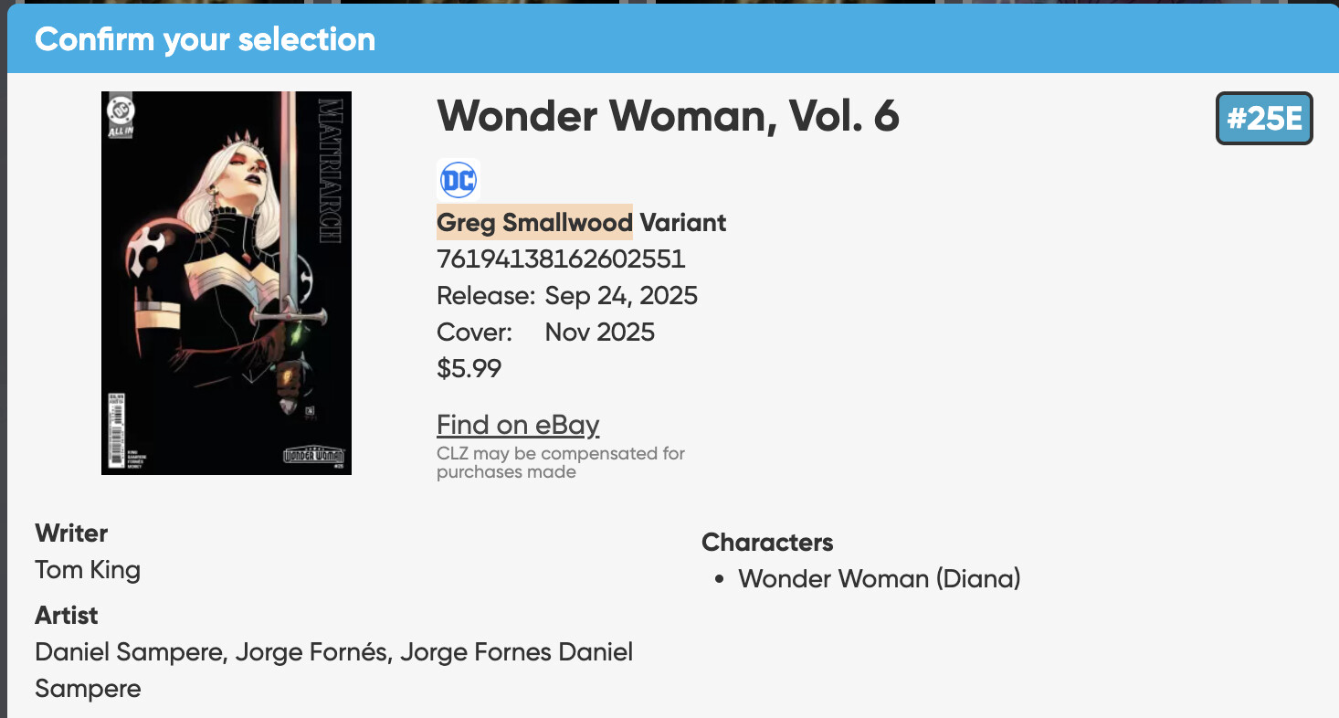 Currently reads: ERROR: Wonder Woman, Vol. 6 #25E Greg Smallwood Variant