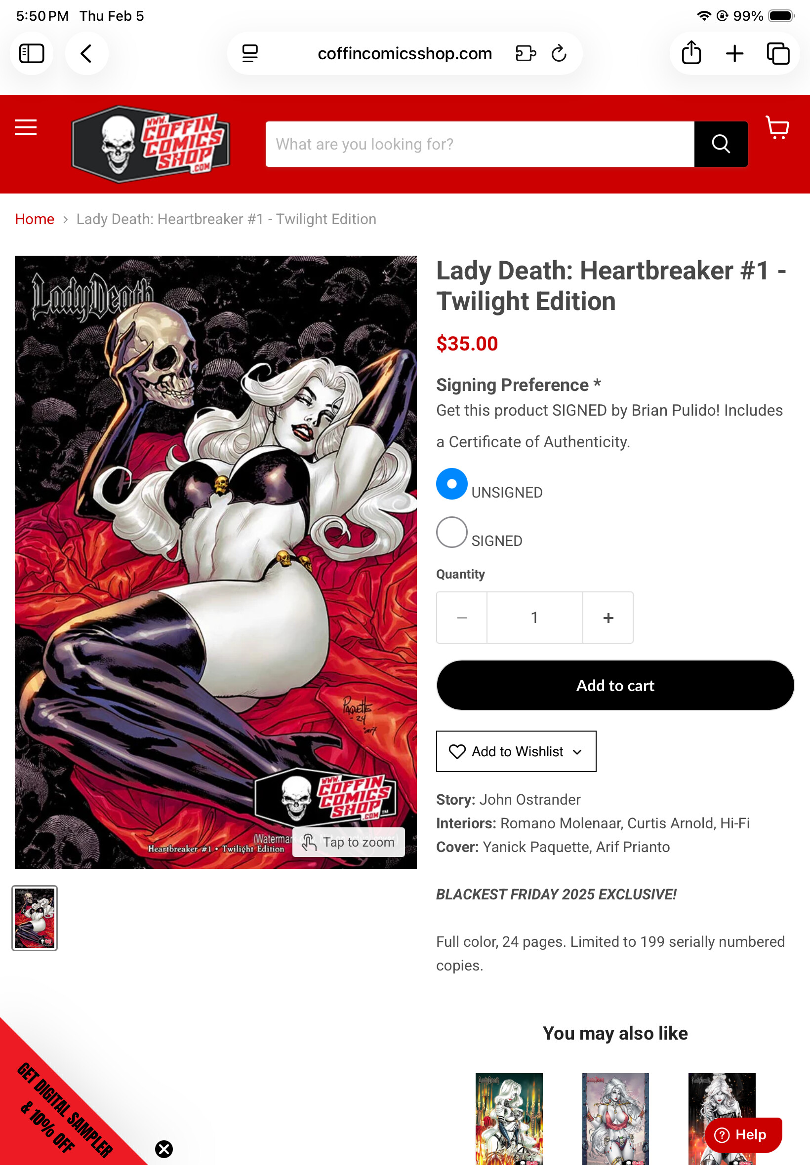Would it be possible to update the cover information for this comic? See below from Coffin Comics website. Based on their usual roles, I believe it is highly likely that Yanick Paquette is the cover artist and Arif Prianto is the cover colorist.