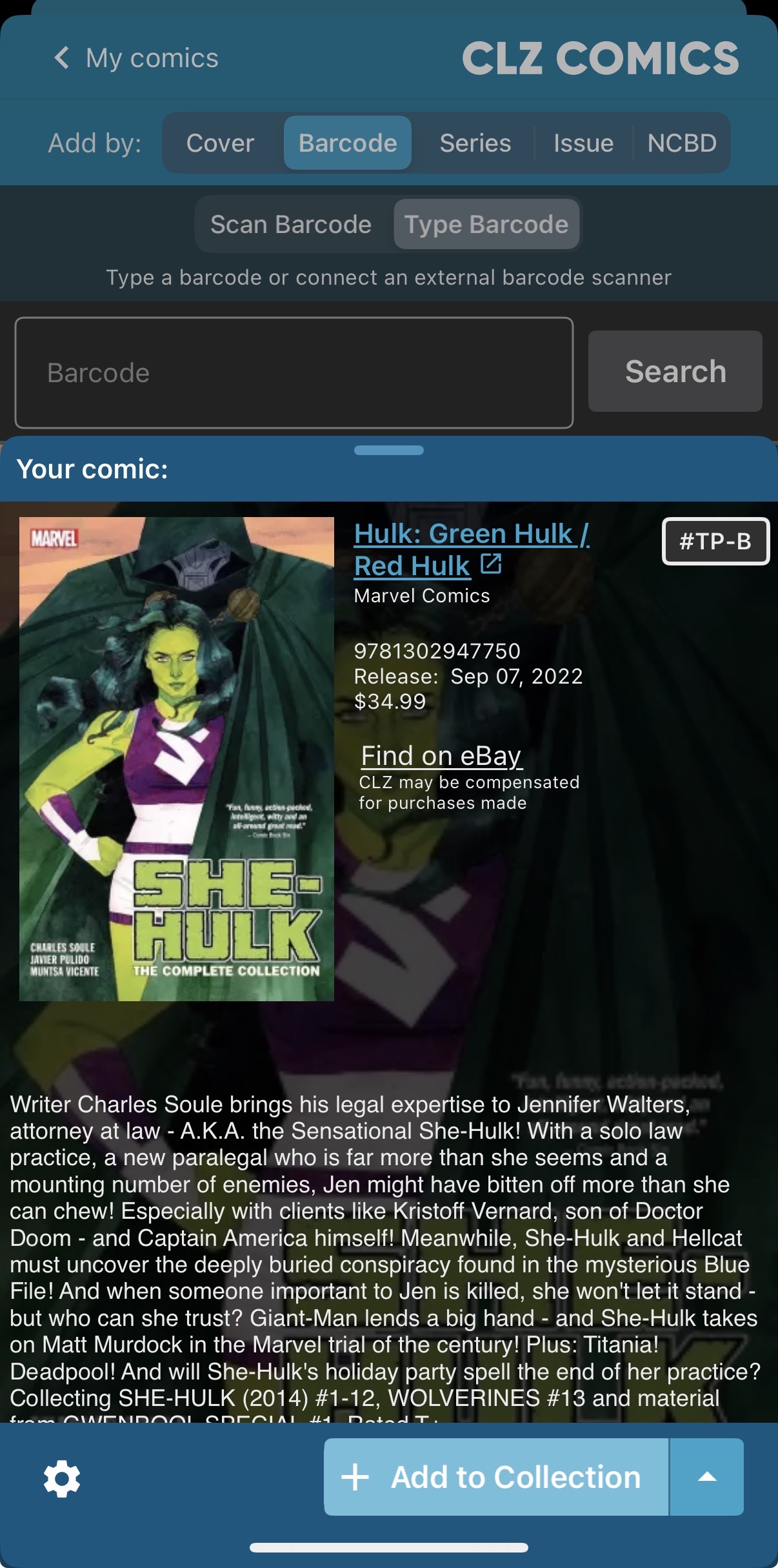 Barcode 9781302947750 is incorrectly listed under the wrong series. It should be under She-Hulk by Charles Soule TP Complete Collection, as it is the 2022 edition of that book. It would still be TP-B in the correct series.