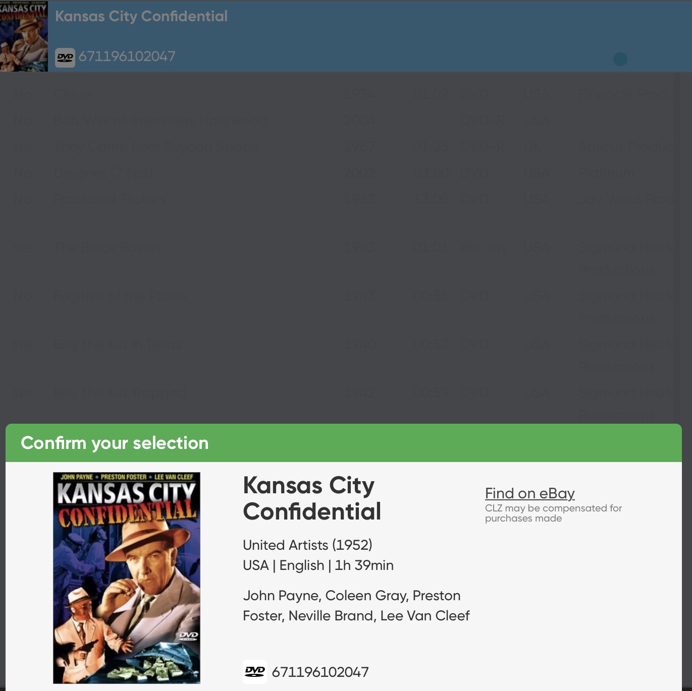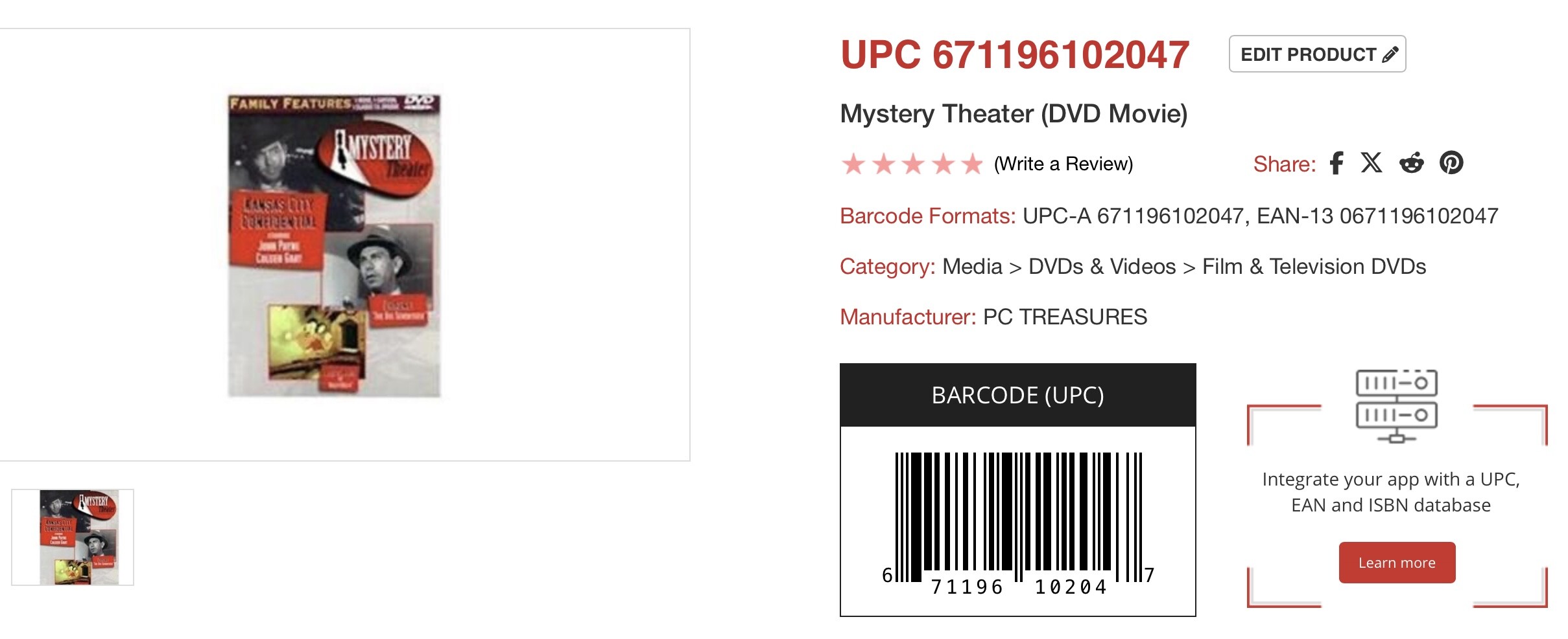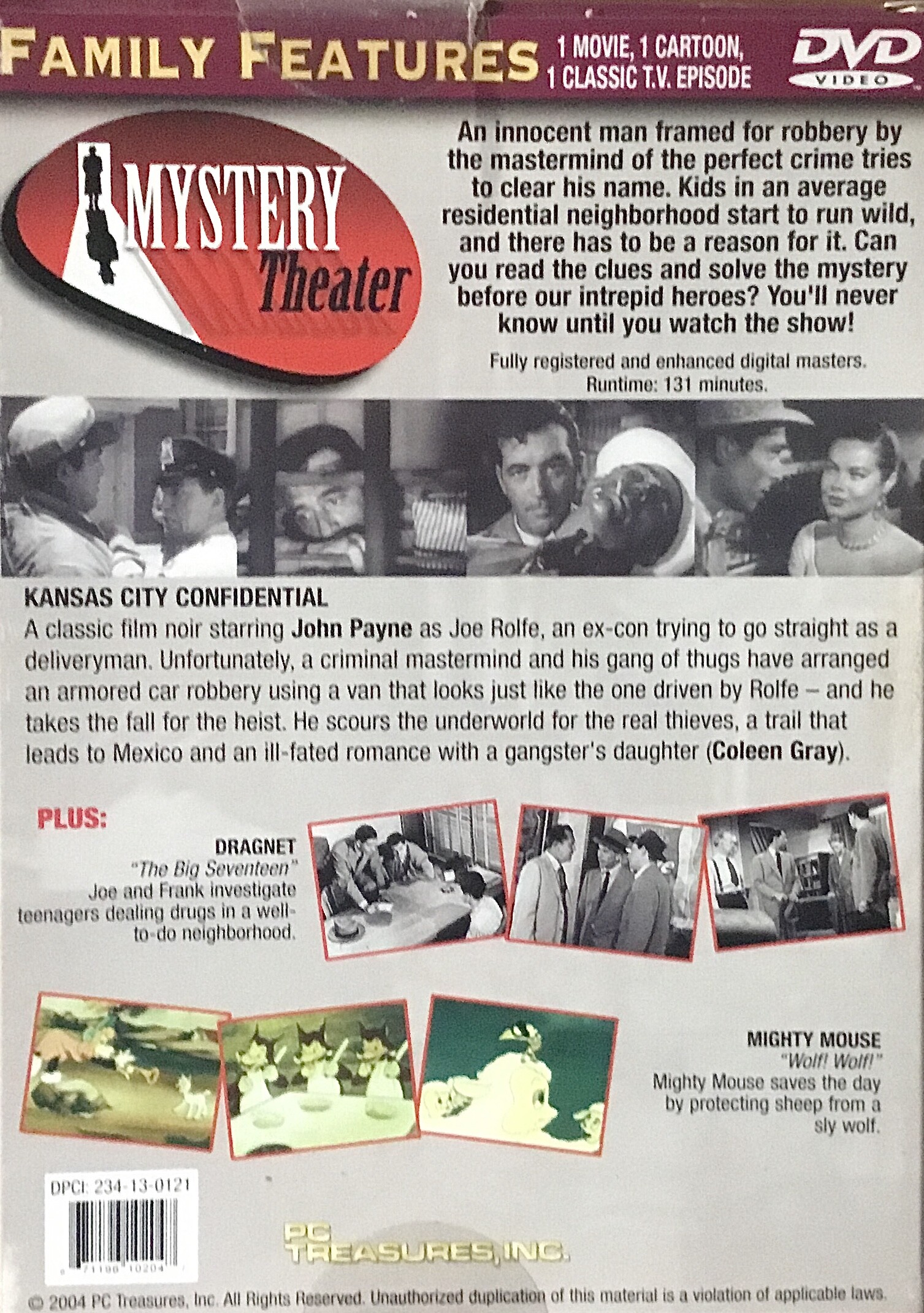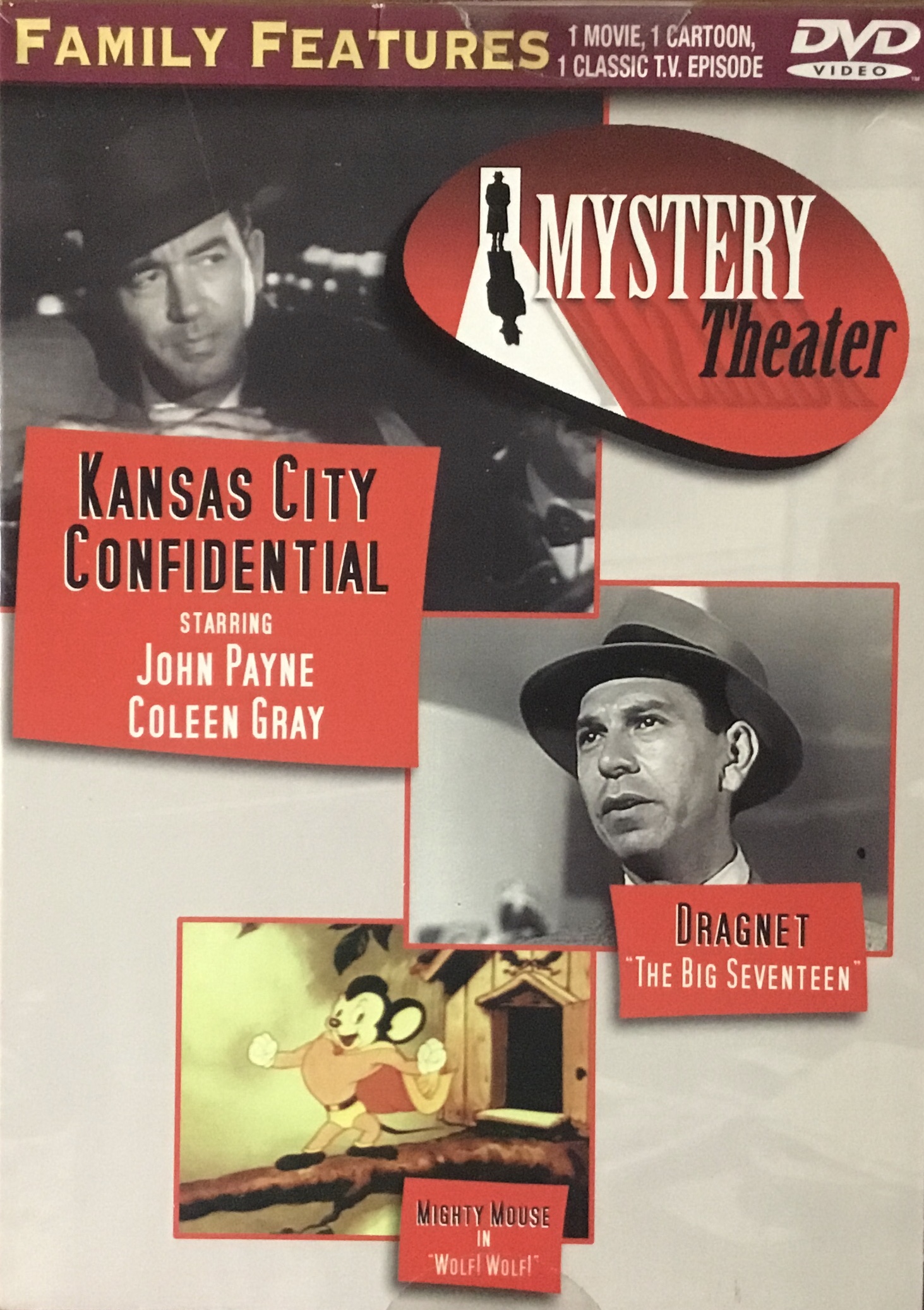 A search for barcode 671196102047 shows an album with the wrong cover for the set, and also omits two of the other contents on the set. Also a title search for Kansas City Confidential doesn’t show this dvd set at all. Title on spine is “Mystery Theater: Kansas City Confidential plus Mighty Mouse and Dragnet”. The actual contents of the set are: