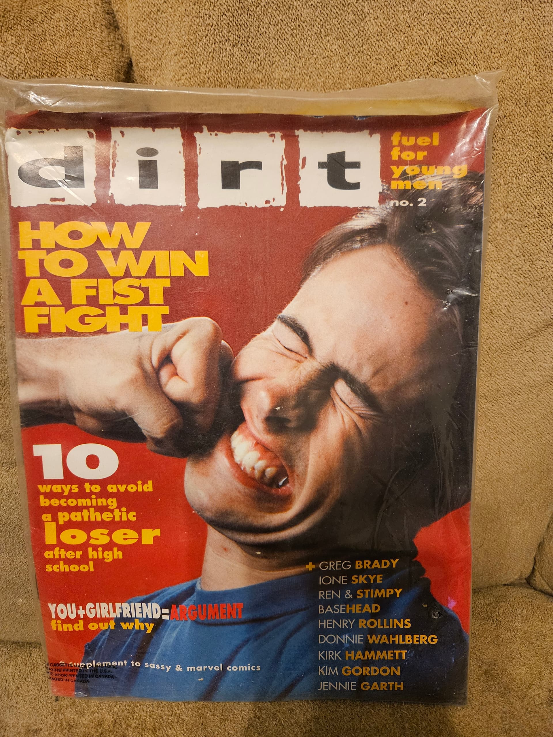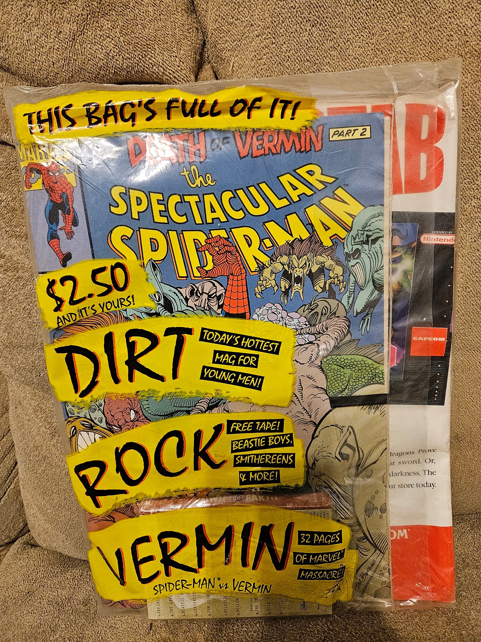 Spectacular Spider-Man 195 polybagged with a copy of Dirt Magazine 2 and a cassette.