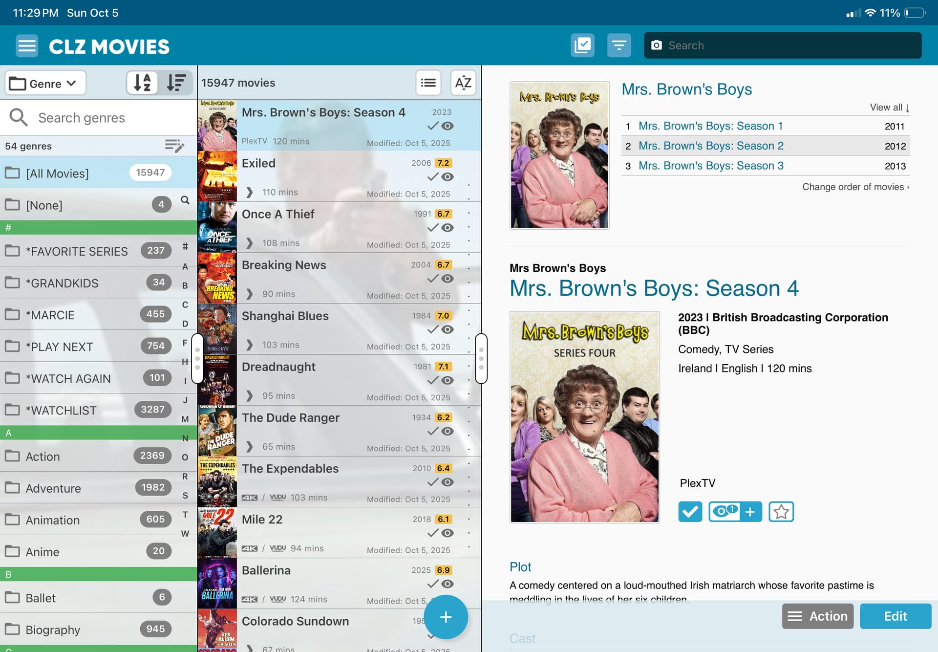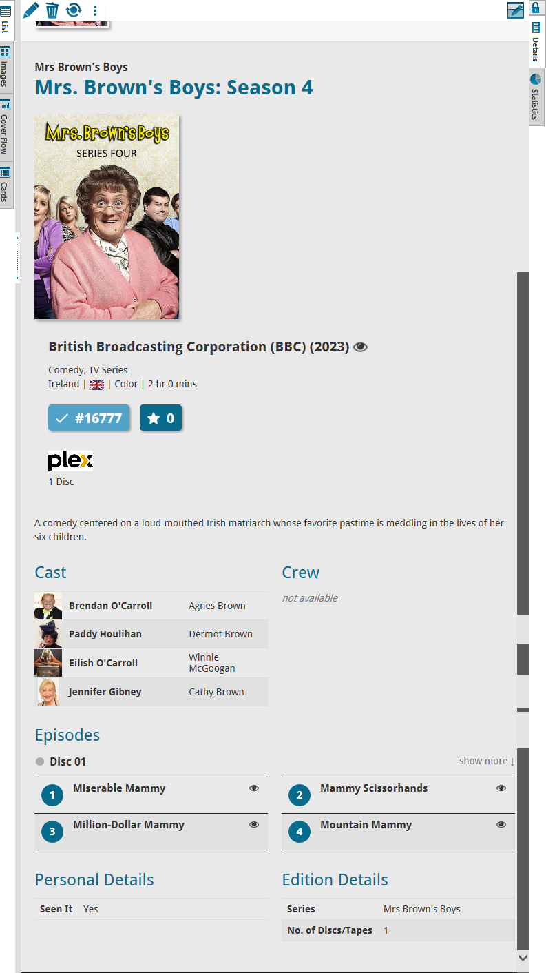 The first is from a series called “Mrs. Brown’s Boys.” When I installed Season 4, it did not enter the four episodes. I did this manually on Movie Collector. Those episodes have never synced, and still haven’t. The two screenshots show how this season looks on Movie Collector and on iOS Mobile app: