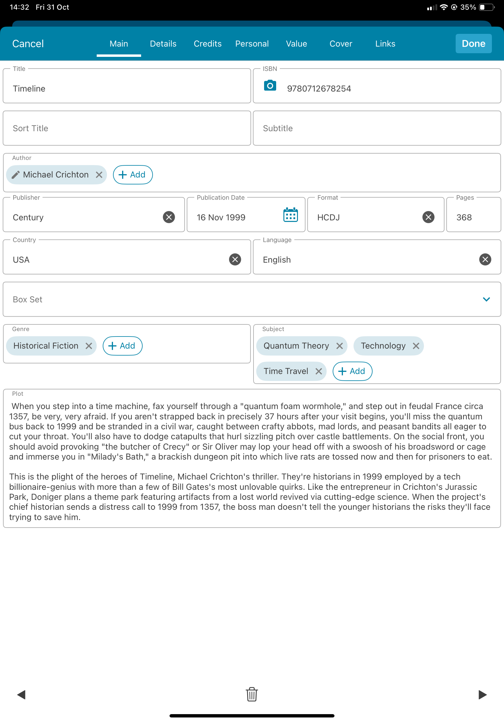 I meant to add: currently, when I input an ISBN-10 to identify a book in your core, and select one to add to my collection, the app automatically applies the ISBN-13 which, of course is not what is in the book itself. Because I’m now manually changing all ISBNs to show what is in the book, I then have to go and manually change what I have in the book record - and it would be so much neater if the app automatically populated both fields.