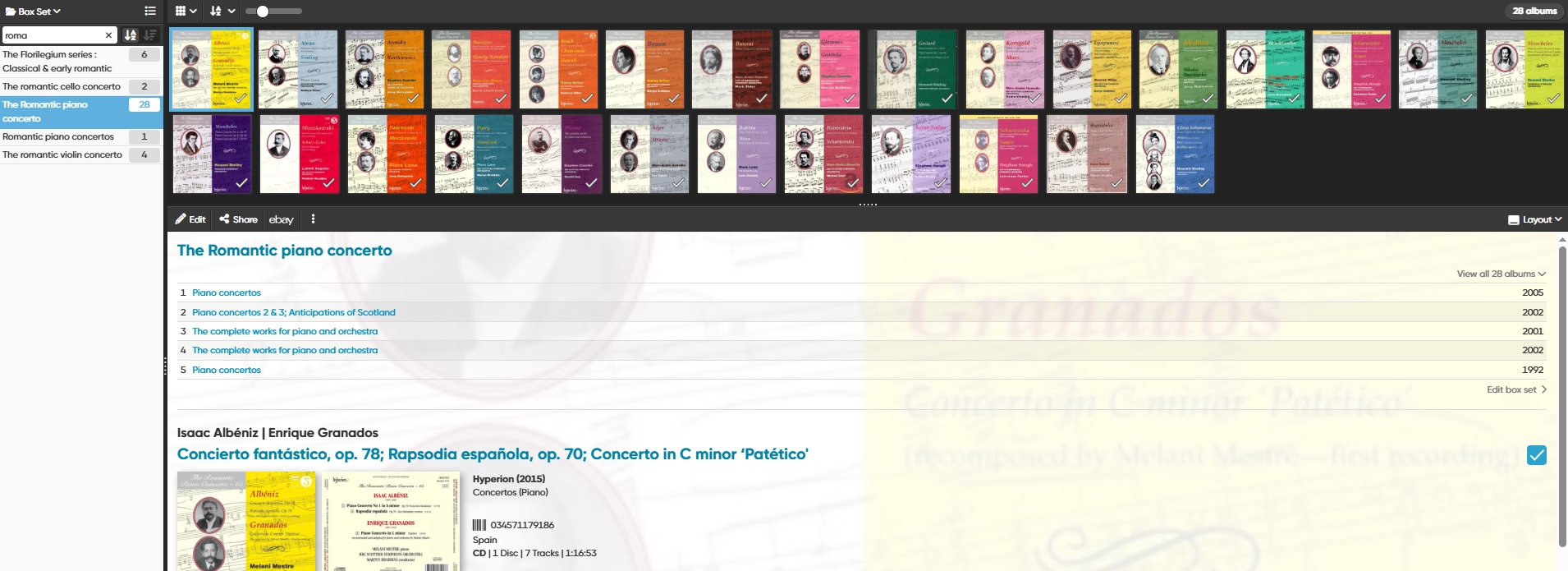 I would put the title of a series. For example, in the screenshot there are 28 albums that are part of the series “The romantic piano concerto”. I would remove this series title from the Box set field to the series field. I must admit, though, that I would miss the series being clearly displayed above the individual album on the main screen. Maybe I’m having second thoughts