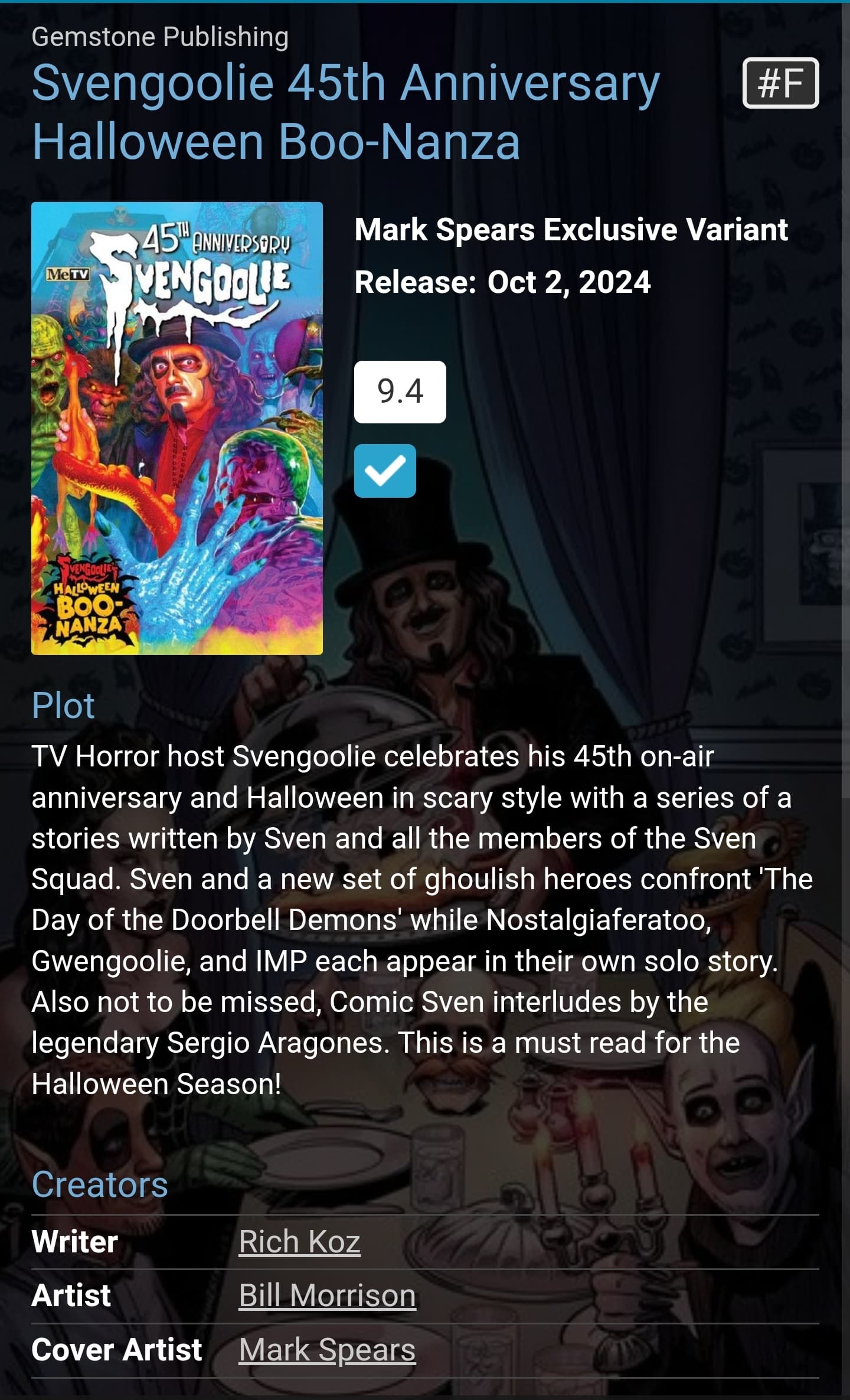 Svengoolie 45th Anniversary Halloween Boo-Nanza (Gemstone, 2024) #F (Spears variant) is on Covrprice here: