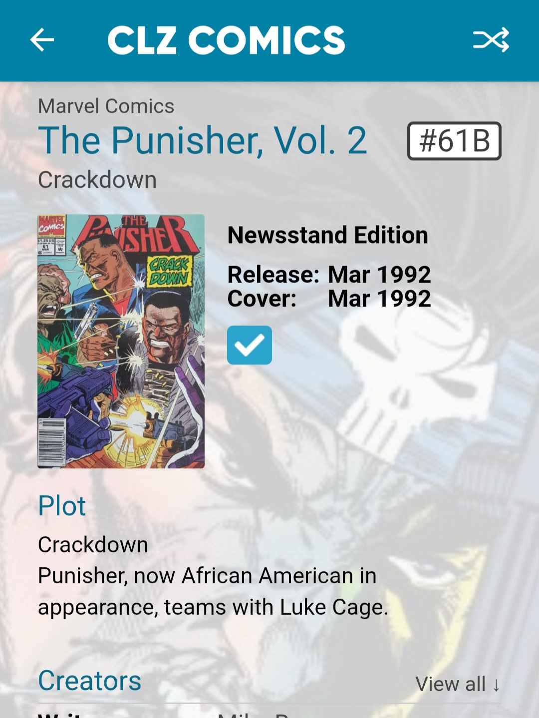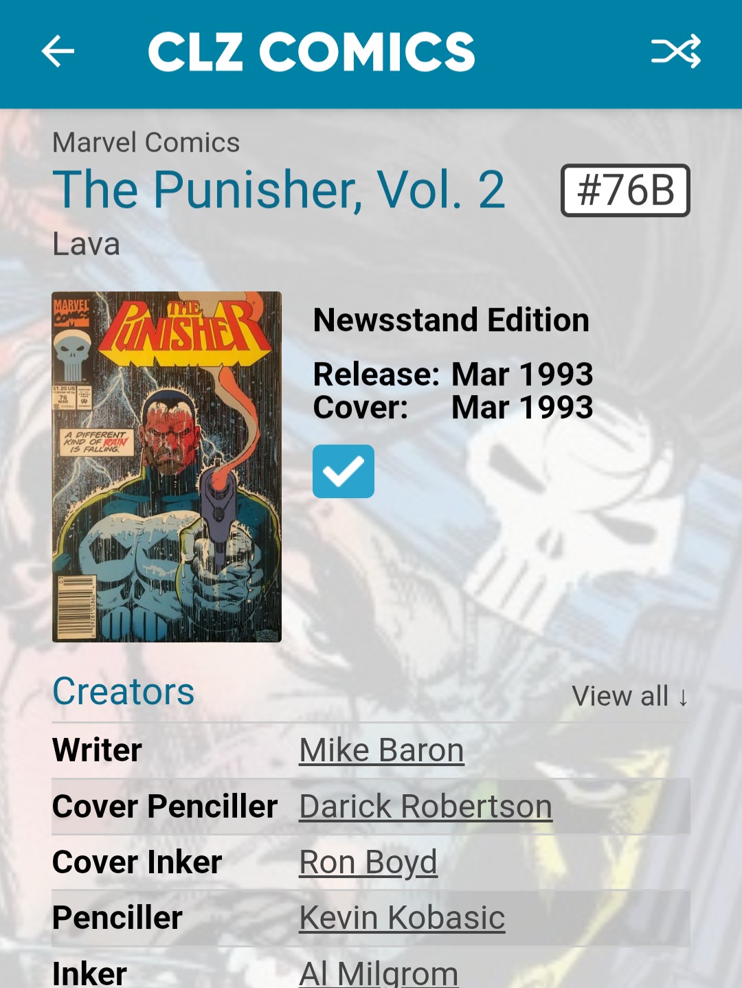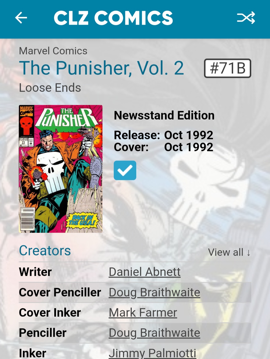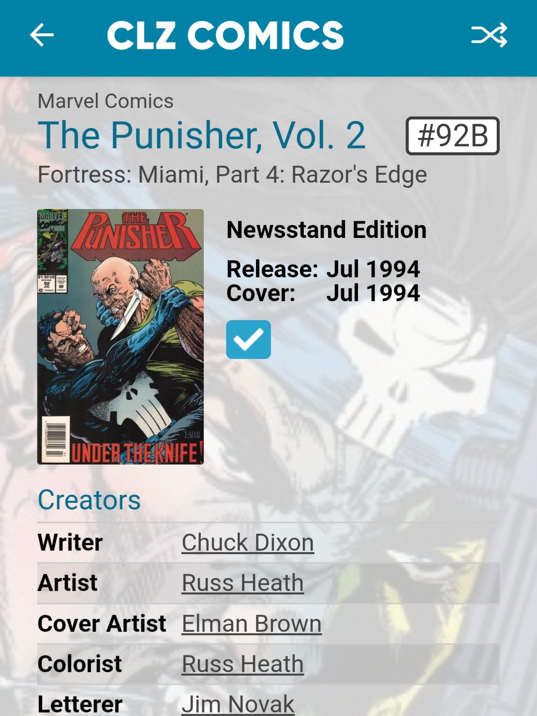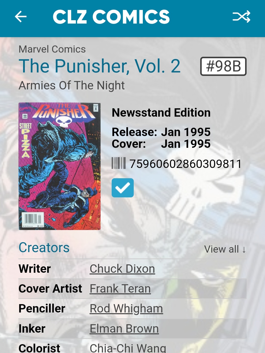 I noticed a number of newsstand editions of the Punisher volume 2 are not linked to CovrPrice. They are issues: 12B, 61B, 71B, 76B, 82B, 92B, 98B