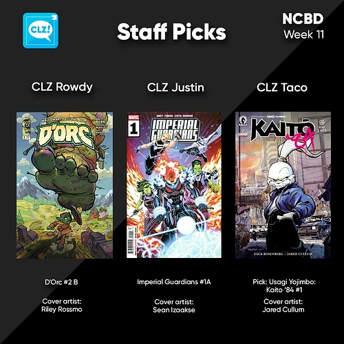 Has the green orc hype caught up to him? Probably.. CLZ Rowdy’s pick for this week is D’Orc #2, especially the B cover by Riley Rossmo. We really enjoyed issue 1, so we can’t wait to give this one a read!