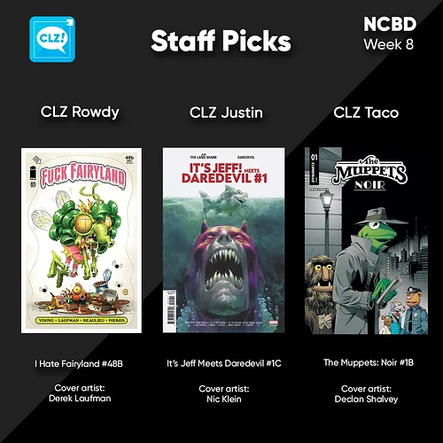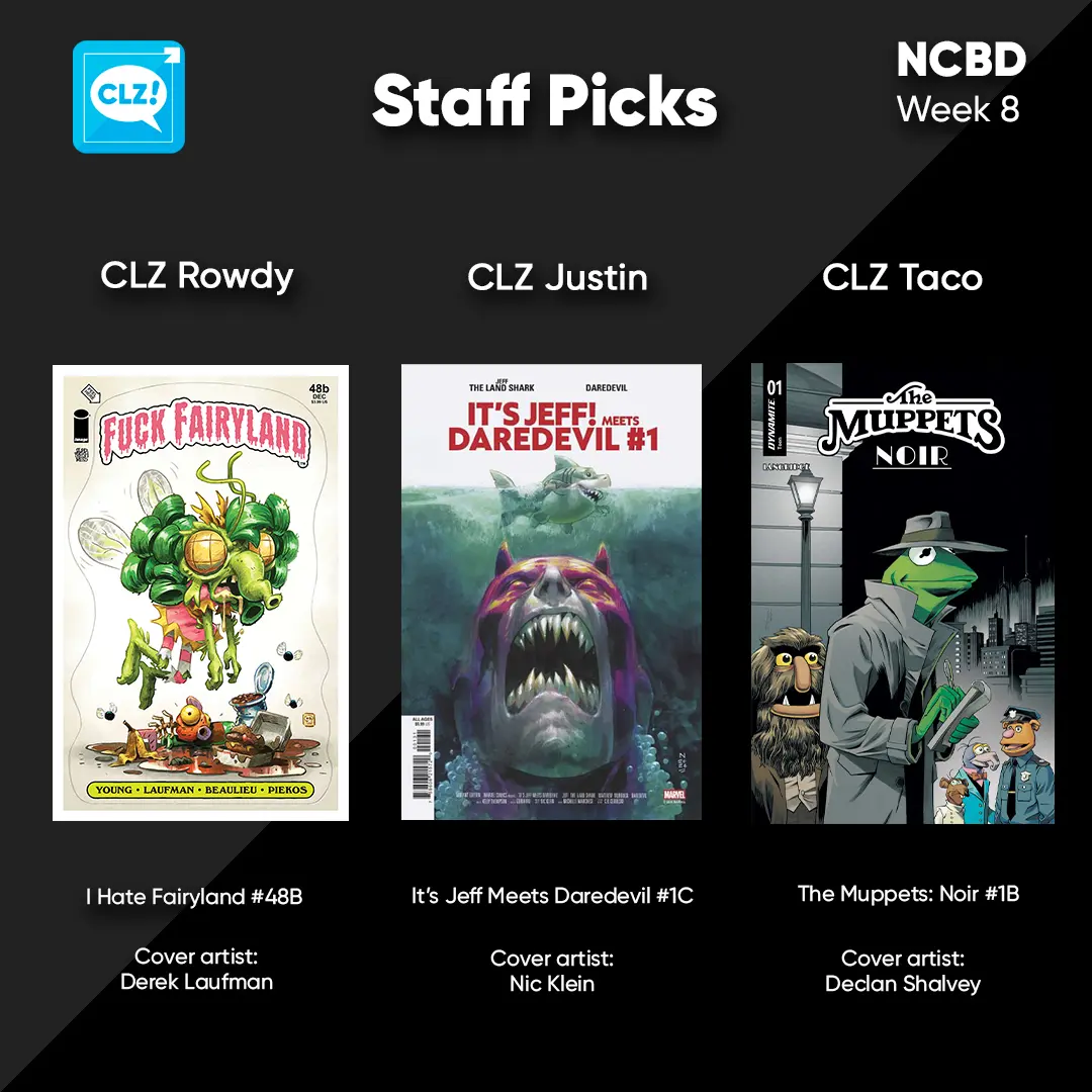 Who doesn’t love Marvel’s baby shark? I sure can’t get enough of him. It’s Jeff Meets Daredevil. Jeff the Land Shark learns the meaning of courage from on other then the man without fear! Love the Jaws homage variant by Nic Klein.