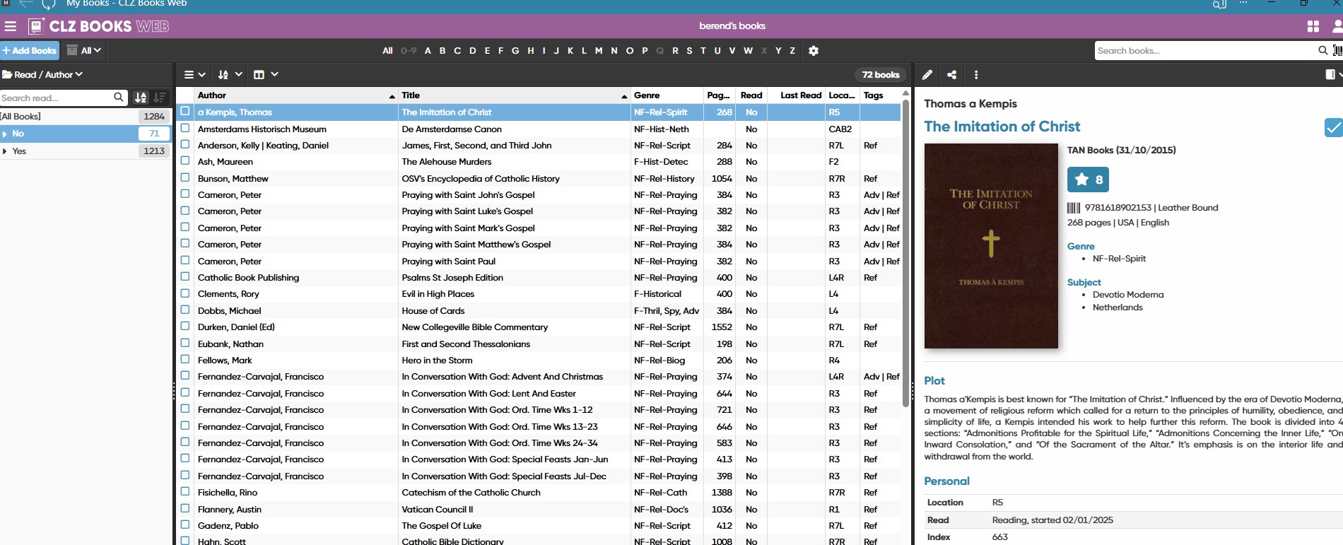 In the previous attachment I sent you, the Read/Author Folder showed 71 books not read, and the central panel showed a total of 72 books not read and 72 books were listed. The book “Imitation of Christ” is included in the list. Thus, one book more in the central list than in the folder.