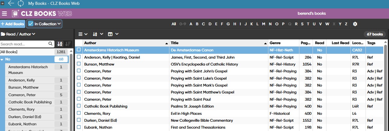 You will note that the attachment now has the Read/Author Folder showing 68 books not read, and the central panel showing a total of 67 books not read and 67 books listed. The “Imitation of Christ” is not included in the list. Thus, one book less in the central list than in the folder!
