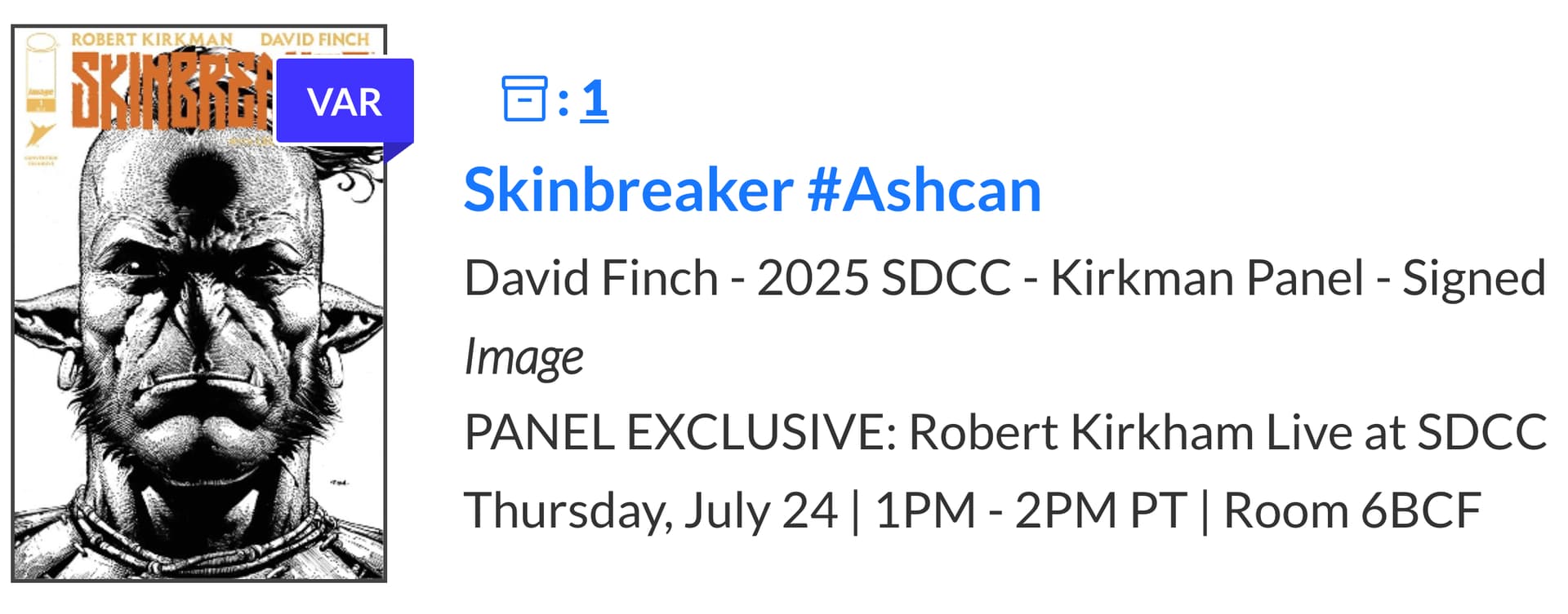 I was trying to add some 2025 SDCC Exclusives to my CLZ inventory and I think a little bit more info should be included in the description for the Skinbreaker Ashcan. It appears to be the 'ā1Aā in CLZ. There is no mention of the fact it is the Kirkman Panel Variant (also, signed by Robert Kirkman). It does show David Finch, though, so that is great. Attached is the listing at Coverprice.