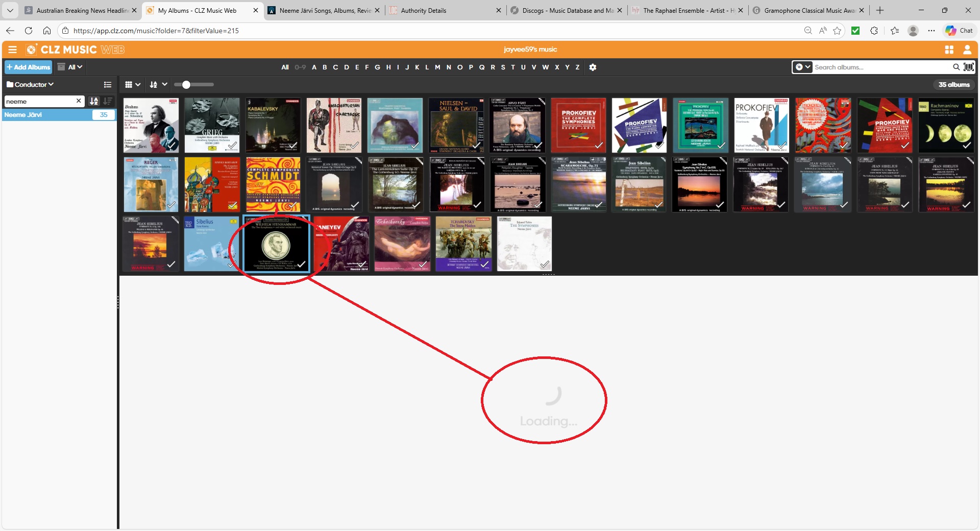 Hi there, I’m having an issue with an album on CLZ Music Web. When I select this album, the record won’t open – I just get a “loading” message with the revolving circle. I haven’t noticed this with any other albums so far. I can access the album ok on the Desktop version and on the mobile app, the problem only seems to be on the Web, and only for this album. It is a multi-disc album containing 4 discs, each disc is linked on CORE to a single disc and years ago when I originally added the album on the Desktop version, I would have scanned each disc then combined the discs into one record to create a multi-disc album. I tried making a small edit on the Desktop record, then syncing to Cloud, but the record still won’t open. I’m wondering whether I need to delete this album and re-add it (a lot of work as a lot of the details will need changing), or can you guys fix it more simply at your end? Attached are screenshots of the main screen with the problem album circled, and the four albums on CORE it is linked to (if that helps). Thank you.