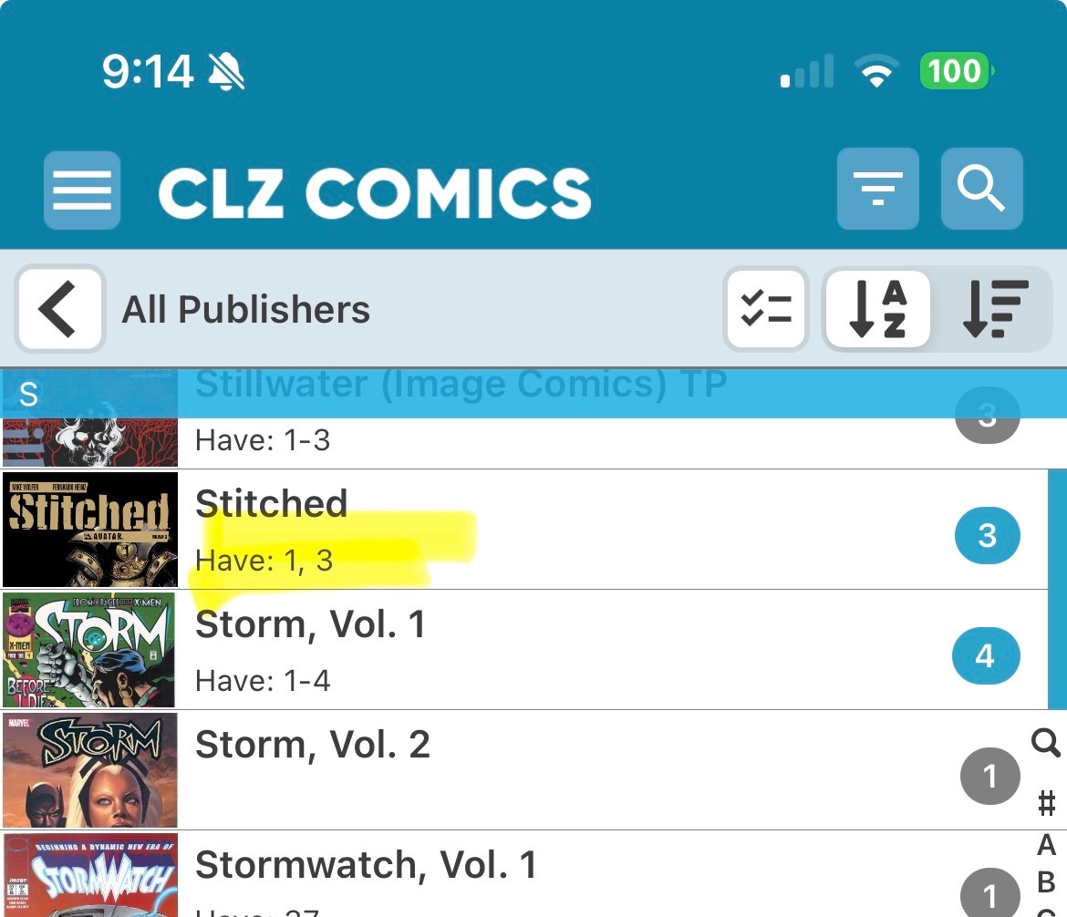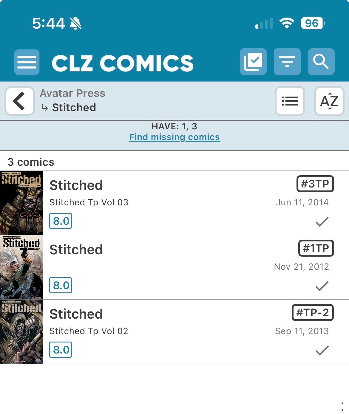 There are 3 TPs that collected the entirety of the series ‘Stitched’ put out by Avatar in 2011. All are included along with the single issues under the same title in core and not under their own title (which is fine I guess). However, TP #2 is numbered in a way that makes it not show up in the app.