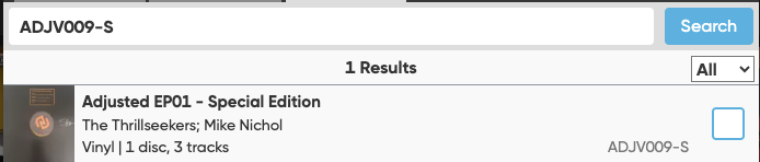 The correct catalog number is ADJV009-S. If you use this in the search, you’ll get the correct EP as the result.