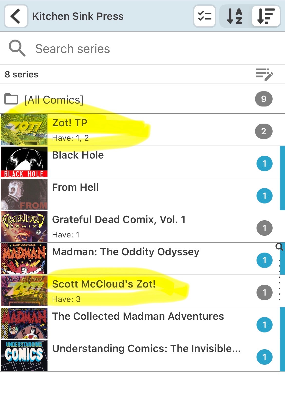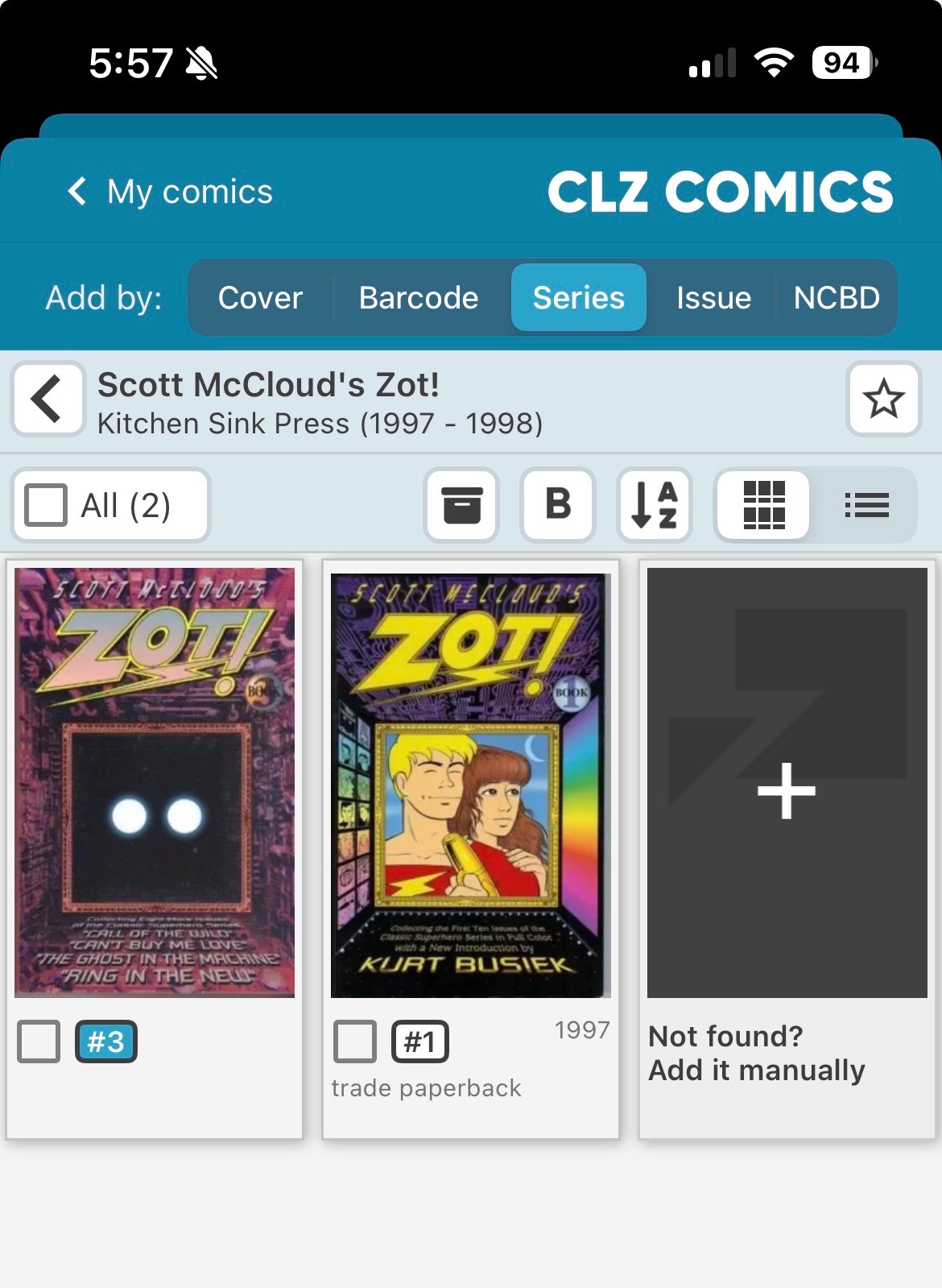 Hi - Zot! (originally put out by Eclipse) was collected into 3 TPs by Kitchen Sink and all of them are in core, but broken up across 2 unique titles. One of which contains #1 & #3 and one of which contains all 3 books. Bar code scanning broke my collection across the 2 titles. Can you please put these all under only 1 title (I don’t care which one)?
