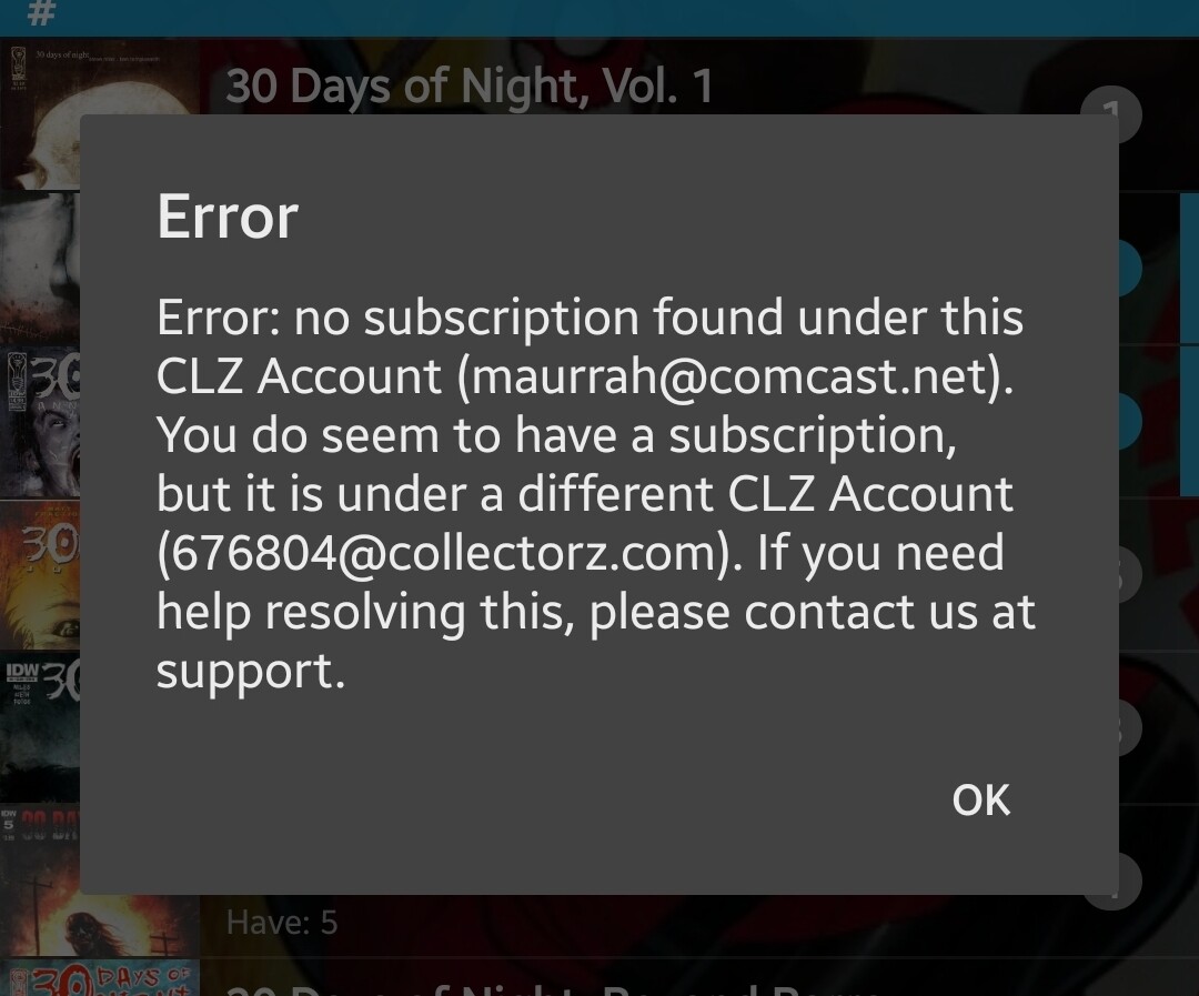 One under maurrah@comcast.net, the second one a temp account for CLZ Comics only. This account was never claimed, hence the error.