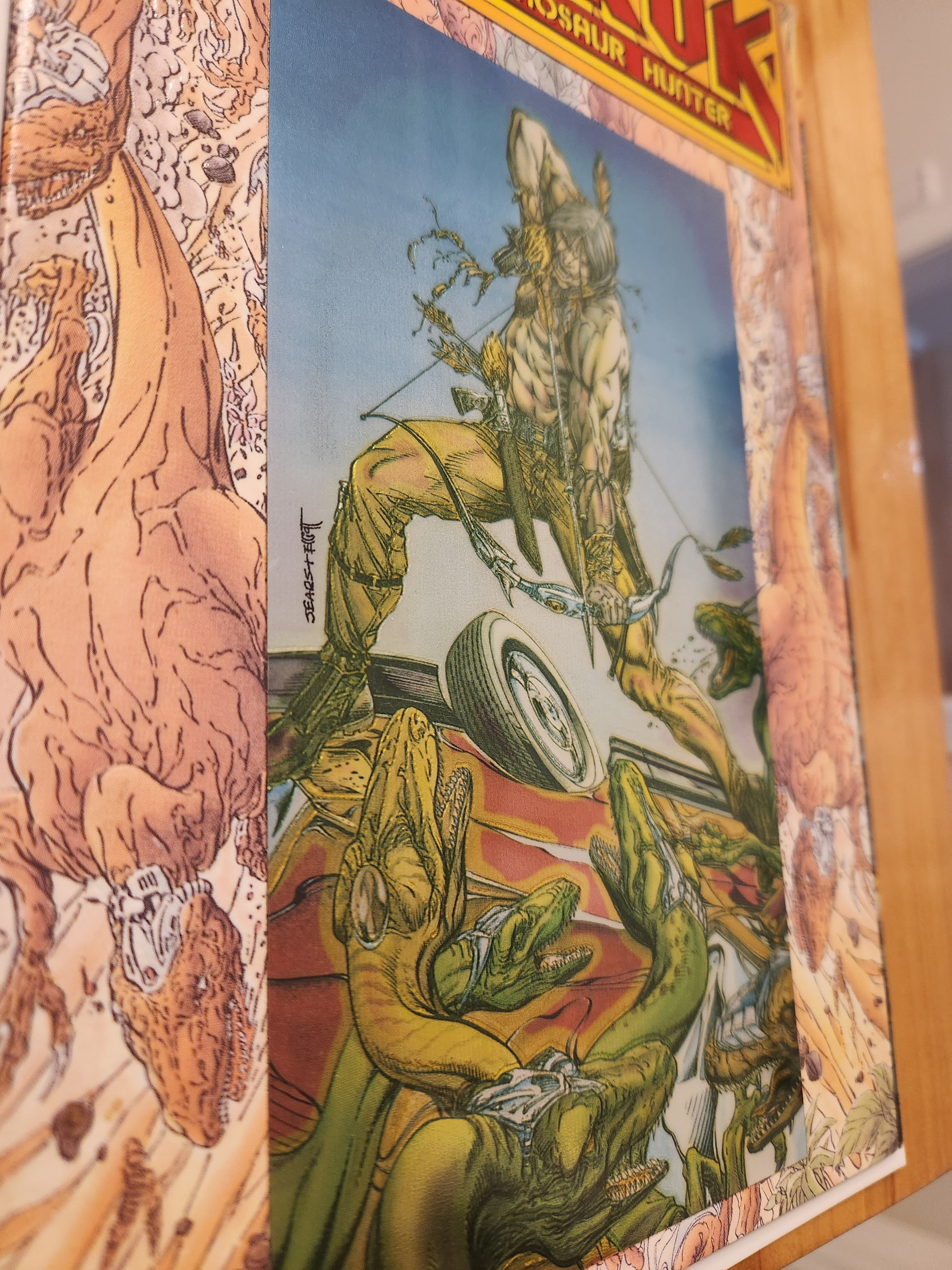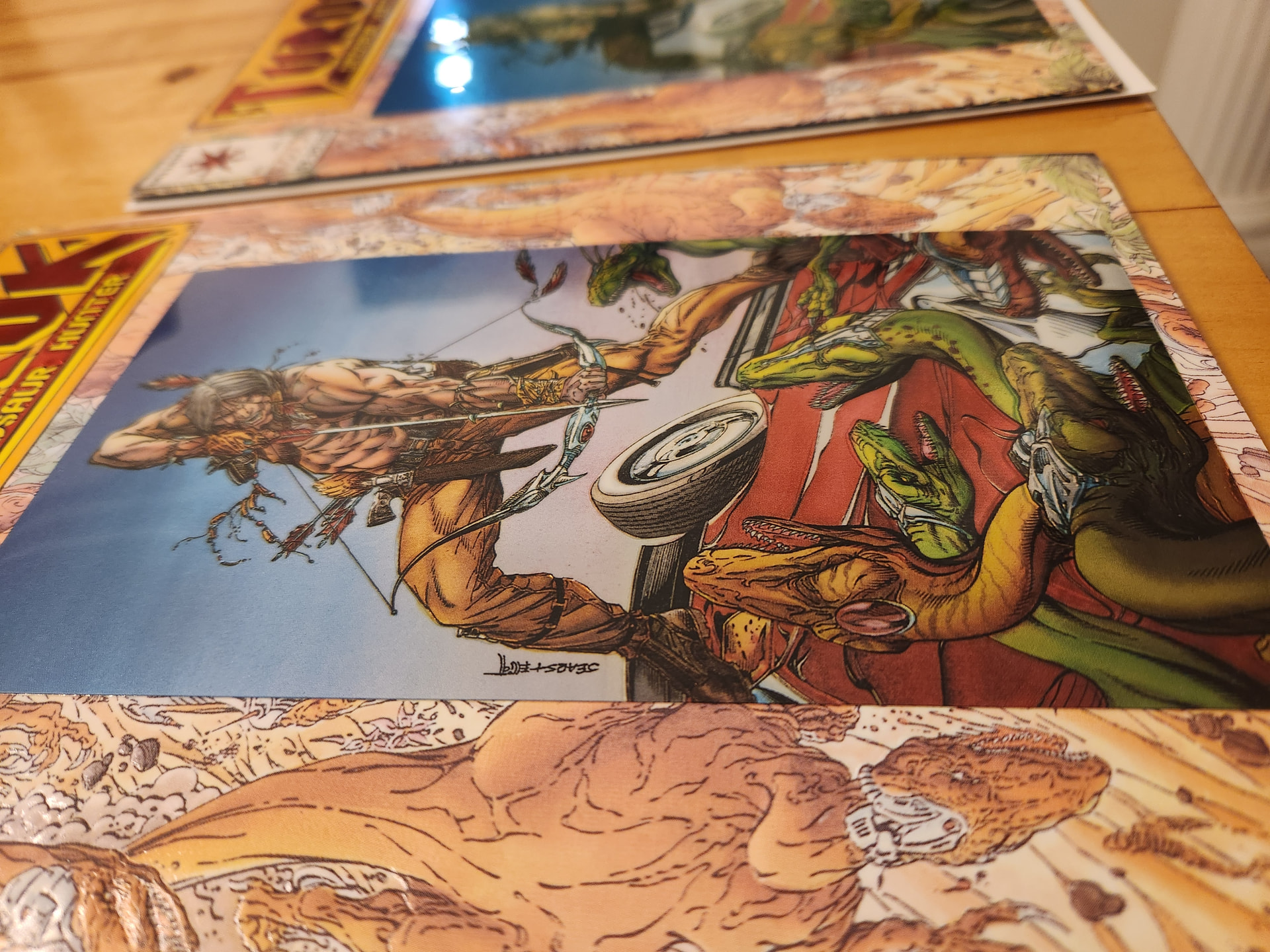 The logo/lettering is exactly the same red. The Book covers are all embossed, but the center section with Turok in it is what is different, one appears much greener than all my other copies of this book. several color differences also. The center section is glued onto the cover and it is plastic/chromium-ish, and they both appear to be sort of reverse embossed, meaning the embossing is on the back of the inset picture while the face of that is smooth. Its a little like a 3d depth effect looking at it up close.