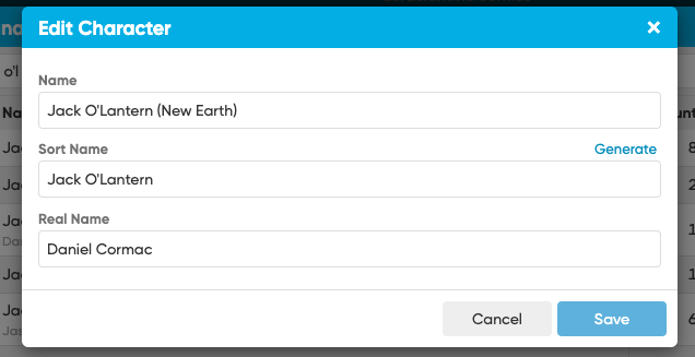 Here is the issue, I have been updating custom characters but it doesn’t seem to update correctly. So in this example I update Jack O’Lantern (Daniel Cormac) to Jack O’Lantern (New Earth) Daniel Cormac, the sort field doesn’t seem to update. No matter how many times I change it.