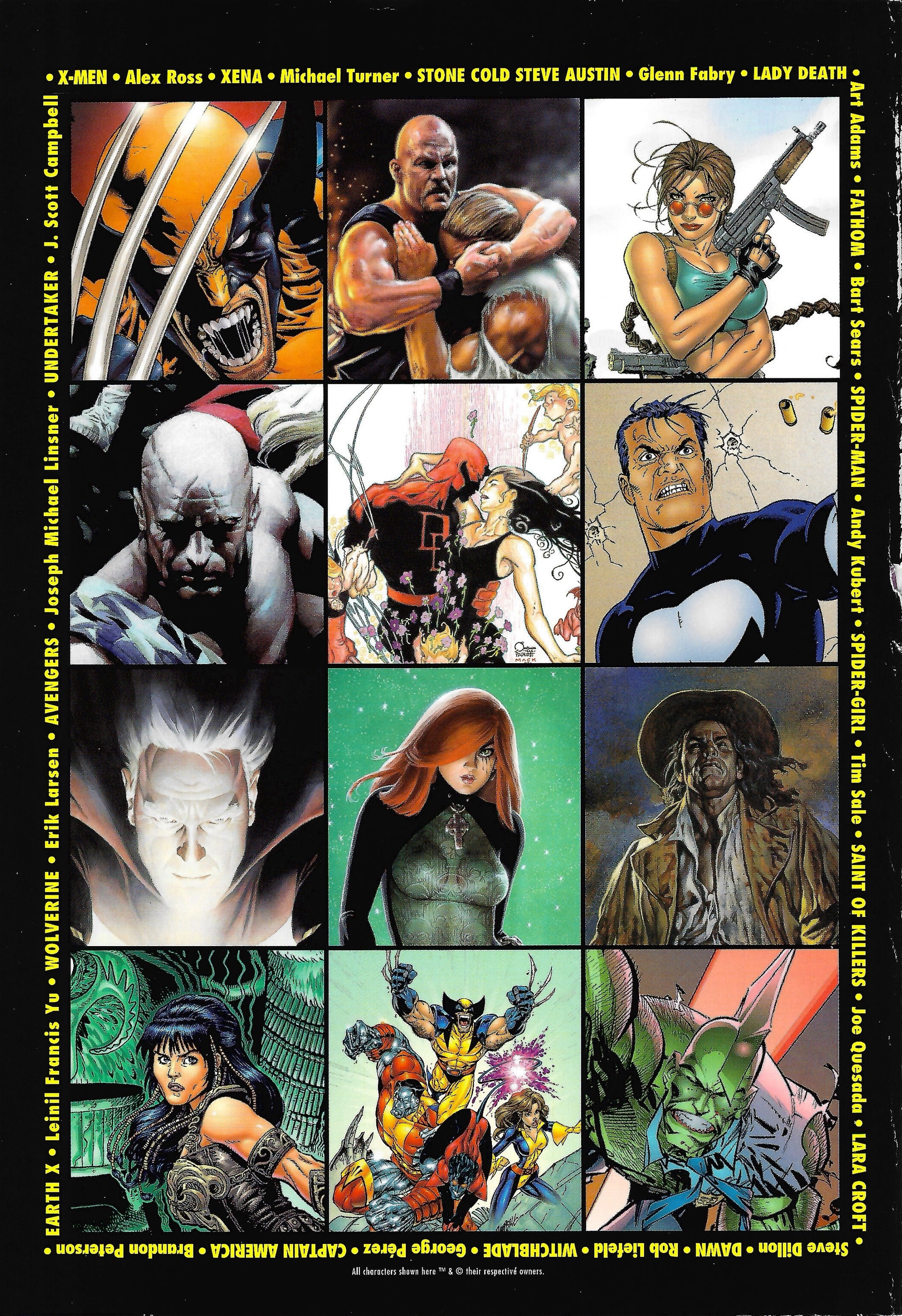 Avengers, Blade, Cable, Captain America, The Falcon, Captain Marvel, Daredevil, Dr. Doom, Earth X, Iron-Man, Mr Fantastic, Punisher, Spider-Girl, Spider-Man, Thor, Wolverine, X-Men, Lady Death, Stone Cold Steve Austin, Undertaker, Supreme, Dawn, Alley Cat, Savage Dragon, Saint of Killers, E.V.E. Protomecha, Fathom, Pyre, Tomb Raider, Witchblade, Darkness, Ian Nottingham, Angelus, Aphrodite 9, Magdalena, Petra, Jasmine, Vampirella, Xena, Gatecrasher